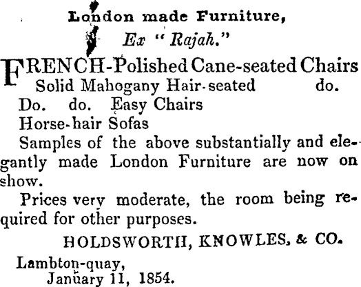 London made Furniture, jt Ex "Rajah." T^RENCH-^olished Cane-seated Chairs *- Solid Mahogany Hair- seated do. Do. do. Easy Chairs Horse-hair Sofas Samples of the above substantially and elegantly made London Furniture are now on show. Prices very moderate, the room being required for other purposes. HOLDSWORTH, KNOWLES, & CO. Lambton-quay, January 11, 1854.