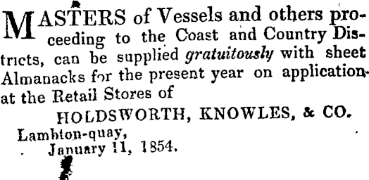 11/f ASTERS of Vessels and others pxoIV± cee ding to the Coast and Country Districts, can be supplied gratuitously with sheet Almanacks for the present year on applicationat the Retail Stores of HOLDSWORTH, KNOWLES, & CO. Lamhtoji-quay, . January 11, 1854.