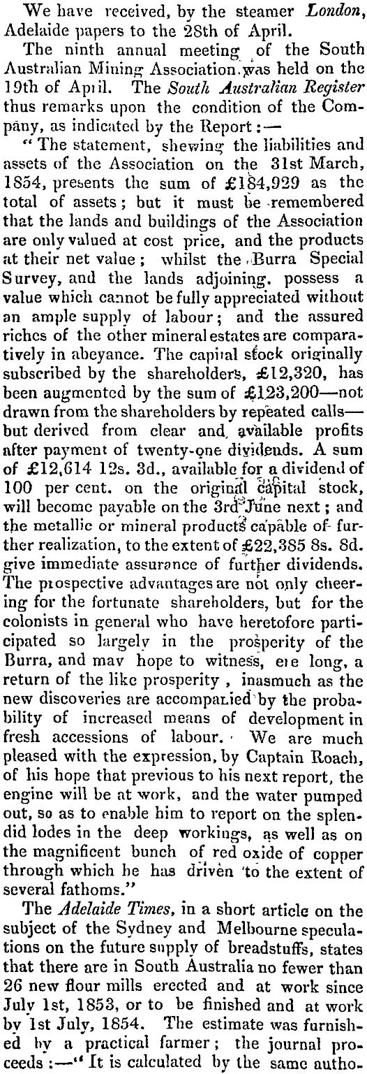 We have received, by the steamer London, Adelaide papers to the 28th of x\pril. The ninth annual meeting of the South Australian Mining Association. y?as held on the 1 9th of Api il. The South Azistralian Register thus remarks upon the condition of the Company, as indicated by the Report : — " The statement, shewing the liabilities and assets of the Association on the 31st March, 1554, presents the sum of £184,929 as the total of assets ; but it must be -remembered that the lands and buildings of the Association are only valued at cost price, and the products at their net value ; whilst the -Burra Special Survey, and the lands adjoining, possess a value which cannot be fully appreciated without an ample supply of labour ; and the assured riches of the other mineral estates are comparatively in abeyance. The capital slock originally subscribed by the shareholders, d£ 1 2,320, has been augmented by the sum of 4123,200 — not drawn from the shareholders by repeated calls — but derived from clear and, available profits after payment of twenty-one dividends. A sum of £12,614 12s. 3d., available for a dividend of 100 per cent, on the original capital stock, will become payable on the 3rd d Jdne next ; and the metallic or mineral product? capable of- further realization, to the extent of £22,385 Bs. Bd. give immediate assurance of further dividends. The piospective advantages are not only cheering for the fortunate shareholders, but for the colonists in general who have heretofore participated so largely in the prosperity of the Burra, and may hope to witness, eie long, a return of the like prosperity , inasmuch as the new discoveries are accompanied hby the probability of increased means of development in fresh accessions of labour. - We are much pleased with the expression, by Captain Roach, of his hope that previous to his next report, the engine will be at -work, and the water pumped out, so as to enable him to report on the splendid lodes in the deep workings, as well as on the magnificent bunch of red oxide of copper through which be has driven 'to the extent of several fathoms." The Adelaide Times, in a short article on the subject of the Sydney and Melbourne speculations on the future supply of breadstuff's, states that there are in South Australia no fewer than 26 new flour mills erected and at work since July Ist, 1853, or to be finished and at work by Ist July, 1854. The estimate was furnished by a practical farmer ; the journal proceeds :—": — " It is calculated by the same autho-