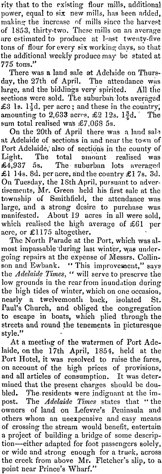 , rity that to the existing flour mills, additional power, equal to six new mills, has been added, making the increase, nf mills since the harvest of 1853, thirty-two. These mills on an average are estimated to produce at I'-ast twenty-five tons of flour for every six working days, so that the additional weekly produce may be stated at 775 tons." There was a land sale at Adelaide on Thursday, the 27th of April. The attendance was large, and the biddings very spirited. All the sections were sold. The suburban lots averaged £3 Is. \\A. per acre; and these in the country; amounting to 2.G33 acros, £2 12s. lfd. ' The sum total realised was £7,068 ss. On the 20th of April there was a land sal? at Adelaide of sections in and near the town of Port Adelaide,* also of sections in the county of Light. The total amount realised was £4,937 ss. The suburban lots averaged £1 14s. Bd. per acre, and the country £1 7s. 3d. On Tuesday, the ISth April, pursuant to advertisements, Mr. Green held his first sale at the township of Smithfield, the attendance was large, and a strong 1 desire to purchase was manifested. About 19 acres in all were sold, which realised the high average of £61 per acre, or £1175 altogether. The North Parade at the Port, which was almost impas&able "during last winter, was undergoing repairs at the expense of Messrs. Collinson and Ewbank. " This improvement," says the Adelaide Times, " will serve to preserve the low grounds in the rear from inund.ition during the high tides of winter, which on one occasion, nearly a twelvemonth back, isolated St. Paul's Church, and obliged the congregation to escape in boats, which plied through the streets and round the tenements hi picturesque style." At a meeting of the watermen of Port Adelaide, on the 17th April, 1854, held at the Port Hotel, it was resolved to raise the fares, on account of the high prices of provisions, and all articles of consumption. It was determined that the present charges should be doubled. Theresidents were indignant at the impost. The Adelaide Times states that " the owners of land on Lefevre's Peninsula and others whom an unexpensive and easy means of crossing the stream would benefit, entertain a project of building a bridge of some description — either adapted for foot passengers solely, or wide and strong enough for a truck, across the creek from above Mr. Fletcher's slip, to a point near Prince's Wharf."