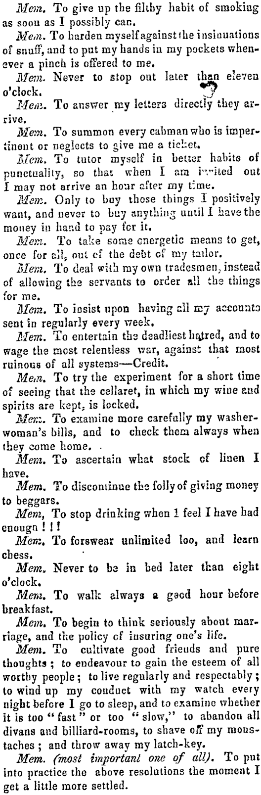 Men. To give up the filthy habit of smoking as soon as I possibly can. Mem. To harden myself against the insinuations of snuff, and to put my hands ia ray pockets whenever a pinch is offered to me. Mem. Never to stop out later tbnri eleven o'clock. zy Mem. To answer my letters directly they arrive. Mem. To summon every cabman who is impertinent or neglects to give me a tichet. ! Mem. To tutor myself in better habits of | punctuality, so tbas when I am h"ited out | I may not arrive an hoar after my time. ! Mem. Only to buy those things I positively want, and never to buy anything until I have the money in hand to pay for it. Mem. To take some energetic means to get, once for ali soul s oul cf the debt cf my tailor. Mem. To deal with my own tradesmen, instead of allowing the servants to order all the things for me. Man. To insist upon having ell my accoanta sent in regularly every week. Mem. To entertain ths deadliest hatred, and to wage the cacst relentless war, against that most ruinous of all systems — Credit. Me,n. To try the experiment for a short time of seeing that the cellaret, in which my wine and spirits are kept, is locked. Mem. To examine more carefully my washerwoman's bills, and to check them always when they come home. . Mem. To ascertain what stock cf liaen I have. Mem. To discontinue the folly of giving money to beggars. Mem, To stop drinking when 1 feel I have had enougn ! ! ! Mem, To forswear unlimited 100, and learn chess. Mem, Never to ba in bed later than eight o'clock. Mem. To walk always a gaod hour before breakfast. Mem. To begin to think seriously about marriage, and the policy of insuring one's life. Mem. To cultivate good friends and pure thoughts ; to endeavour to gain the esteem of all worthy people ; to live regularly and respectably ; to wind up my conduct with my watch every i night before I go to sleep, and to examine whether it is too " fast " or too " slow," to abandon all divans and billiard-rooms, to shave off my moustaches ; and throw away my latch-key. Mem. (most important one of all). To put into practice the above resolutions the moment I get a little more settled.