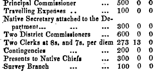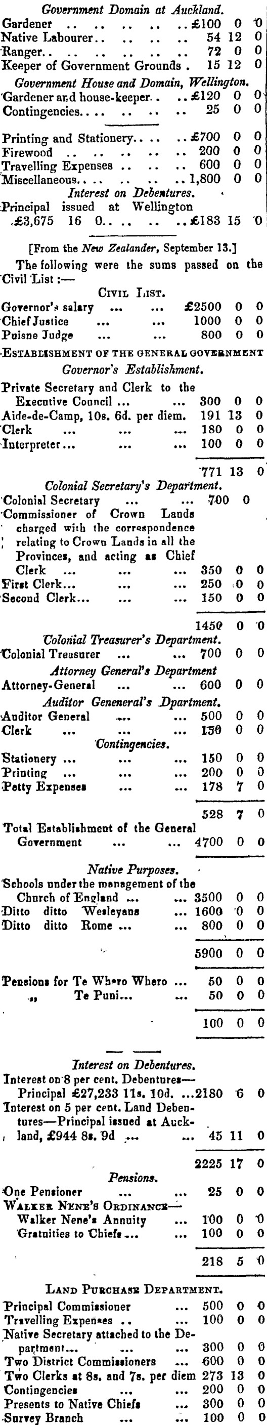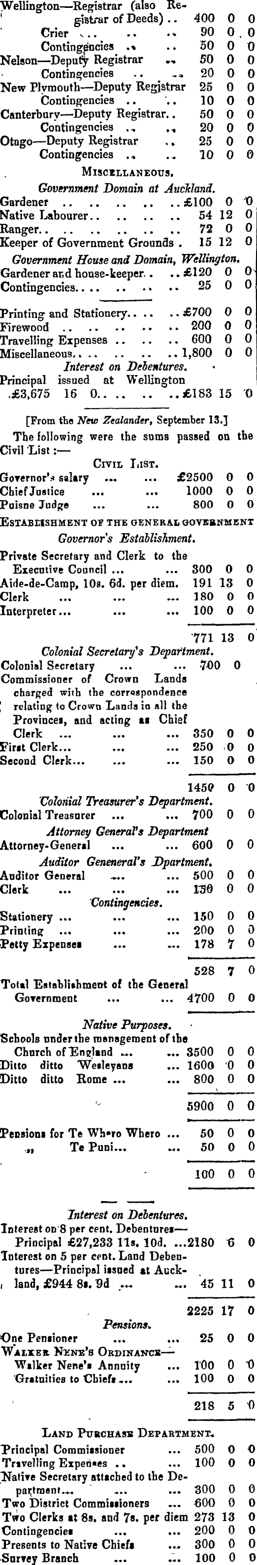 "Wellington — Registrar (also Re1 gißtrar of Deeds) .. 400 0 0 Crier 90 0 , 0 Contingencies .« .. 50 0 t) Nelson— Deputy Registrar 50 0 0 Contingencies .. ,» 20 0 0 New Plymouth— Deputy Registrar 25 0 0 Contingencies .. '. . 10 0 0 Canterbury — Deputy Registrar. . 50 0 0 Contingencies ... 20 0 0 Otago — Deputy Registrar . . 25 0 0 Contingencies .* ... 10 0 0 Miscellaneous. Government Domain at Auckland. Gardener £100 0 D Native Labourer 54 12 0 Ranger 72 0 0 Keeper of Government Grounds . 15 12 0 Government House and Domain, Wellington. 'Gardener ar,d house-keeper. . ..£l2O 0 0^ Contingencies » • • 25 0 0 Printing and Stationery. £700 0 0 Firewood 200 0 0 Travelling Expenses 600 0 0 Miscellaneous 1,800 0 0 Interest on Debentures. Principal issued at Wellington ,£3,675 16 0 £183 15 0 [From the New Zealander, September 13.] The following were the sums passed on the "Civil List : — Civil List. Governor's saliry £2500 0 0 Chief Justice ... ... 1000 0 0 Puisne Judge ... ... 800 0 0 ■Establishment of the general govkbnmbnt Governor's Establishment. Private Secretary and Clerk to the Executive Council ... ... 300 0 0 Aide-de-Carap, 10s. 6d. per diem. 191 13 0 Clerk ... ... ~. 180 0 0 Interpreter... ... ... 100 0 0 771 13 0 Colonial Secretary's Department. Colonial Secretary ... ... >7©o 0 Commissioner of Crown Lands charged with the correspondence ) relating to Crown Lands in all the Provinces, and acting at Chief Clerk ... ... ... 350 0 0 First Clerk... ... ... 250 0 0 Second Clerk ... 150 0 0 145<? 0 0 Colonial Treasurer's Department. Colonial Treasurer ... ... 700 0 0 Attorney GeneraYs Department Attorney- General ... ... 600 0 0 Auditor GeneneraVs DpartmenU Auditor General ~. ... 500 0 0 Clerk ... ... ... 130 0 0 Contingencies. Stationery ... ... ... 150 0 0 Printing ... ... ... 200 0 0 Petty Expense! ... ~. 178 7 0 528 7 0 Total Establishment of the General Government ... ... 4700 0 0 Native Purposes. "Schools under the management of the Church of England .... ... 3500 0 0 Ditto ditto Wesleyans ... 1600 0 0 Ditto ditto Home ... ... 800 0 0 5900 0 0 Pension! for Te Whno Whero ... 50 0 0 .„ TePunu.. «. 50 0 0 100 0 0 100 0 0 Interest on Debentures. Interest on 8 per cent. Debentures — Principal £27,233 11s. lOd. ...2180 tf 0 Interest on 5 per cent. Land Debentures — Principal issued at Auck- < land, £944 Bi. 3d .... ... 45 11 0 2225 17 0 Pensions* One Pensioner ... ... 25 0 0 Waixbr Nenb's Okdinajtcs— Walker Nene't Annuity ... 100 0 D Gratuities to Chiefs ,.. ... 100 0 0 218 5 0 218 5 0 Land Purchase Department. Principal Commissioner ... 500 0 0 Travelling Expenses .. ... 100 0 0 Secretary attached to the Departments. ... ... 300 0 0 Two District Commissioners ~. 600 0 0 Two Clerks at Bs. and 7s. per diem 273 13 0 Contingencies ... ... 200 0 t) Presents to Native Chiefs ... 300 0 0 Surrey Branch ... .;. 100 0 0