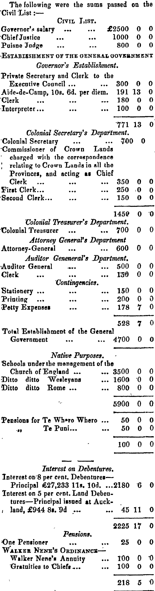 The following were the sums passed on the "Civil List : — Civil List. Governor's saliry £2500 0 0 Chief Justice ... ... 1000 0 0 Puisne Judge ... ... 800 0 0 ■Establishment of the general govkbnmbnt Governor's Establishment. Private Secretary and Clerk to the Executive Council ... ... 300 0 0 Aide-de-Carap, 10s. 6d. per diem. 191 13 0 Clerk ... ... ~. 180 0 0 Interpreter... ... ... 100 0 0 771 13 0 Colonial Secretary's Department. Colonial Secretary ... ... >7©o 0 Commissioner of Crown Lands charged with the correspondence ) relating to Crown Lands in all the Provinces, and acting at Chief Clerk ... ... ... 350 0 0 First Clerk... ... ... 250 0 0 Second Clerk ... 150 0 0 145<? 0 0 Colonial Treasurer's Department. Colonial Treasurer ... ... 700 0 0 Attorney GeneraYs Department Attorney- General ... ... 600 0 0 Auditor GeneneraVs DpartmenU Auditor General ~. ... 500 0 0 Clerk ... ... ... 130 0 0 Contingencies. Stationery ... ... ... 150 0 0 Printing ... ... ... 200 0 0 Petty Expense! ... ~. 178 7 0 528 7 0 Total Establishment of the General Government ... ... 4700 0 0 Native Purposes. "Schools under the management of the Church of Enelind .... ... 3500 0 0 Ditto ditto Wesleyans ... 1600 0 0 Ditto ditto Home ... ... 800 0 0 5900 0 0 Pension! for Te Whno Whero ... 50 0 0 .„ TePuni... «. 50 0 0 100 0 0 100 0 0 Interest on Debentures. Interest on 8 per cent. Debentures — Principal £27,233 11s. lOd. ...2180 tf 0 Interest on 5 per cent. Land Debentures — Principal issued at Aucki land, £944 Bf. 3d .« «. 45 11 0 2225 17 0 Pensions* One Pensioner ... ... 25 0 0 "Waiibr Nenb's Ordinajtcs— - Walker Nene't Annuity ... 100 0 D Gratuities to Chiefs ,.. ... 100 0 0 218 5 0 218 5 0