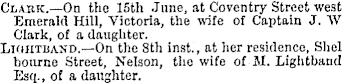 Clakk.—On the 15th June, at Coventry Street west. Emerald Hill, Victoria, the wife of Captain J. W. Clark, of a daughter. Lkuitband.—On the Bth inst., at her residence, Shelbonrne Street, Nelson, the wife of M. Lightband, Esq., of a daughter.