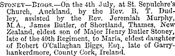 Ston-ey—Bicigs.—On the -Ith July, at St. Sepulchre's Church, Auckland, by the Rev. B. T. Dudley, assisted by the Rev. Jeremiah Murphy, M.A., James Butler, of Shortland, Thames, New Zealand, eldest son of Major Henry Butler Stoney, late of the 40th Regiment, to Maria, eldest daughter of Robert O'Callaghan Biggs, Esq., late of Garryhankerdmore, County Cork, Ireland.