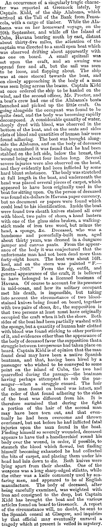An occurrence of a singularly tragic character was reported at Greenock lately, by Captain. Kidd, of the ship Alabama, which arrived at the Tail of the Bank from Pensacola, with a cargo of timber. While the Alabama was on her homeward voyage, on the 20th September, and while off the Island of Cuba, Havana bearing south by east, distant about thirty-five miles, the attention of the captain was directed to a small open boat which was observed drifting about apparently with no one on board. A small spritsail was set upon the craft, and an awning was spread fore and aft, but the sail was seen to be loose, and flapping about. The ship was at once steered towards the boat, and on closely approaching it the body of _ a man was seen lying across the beams. Captain Kidd at once ordered the ship to be hauled on the wind, and the second officer, Mr. Proctor, and a boat's crew had one of the Alabama's boats launched and picked up the little craft. On going alongside the occupant was found to be quite dead, and the body was becoming rapidly decomposed. A considerable quantity of water, deeply dyed with blood, was observed in the bottom of the boat, and on the seats and sides clots of blood and quantities of human hair were found adhering. The boat was brought alongside the Alabama, and on the body of deceased being examined it was found that he had been stabbed on the left side, below the breast, the wound being about four inches long. Several severe injuries were also observed on the head, and they evidently had been inflicted by some hard blunt substance. The body was stretched at full length in the boat, and underneath the head was placed several pieces of carpet, which appeared to have been originally used in the boat for sitting upon. On the person of deceased was found six. dollars in Havana paper currency, but no document or papers were found which could lead to his identification. Inside the boat were found two sheath knives stained all over with blood, two pairs of shoes, a hand lantern with one of the glass sides broken, a walkingstick made of iron tree wood, but minus the head, a sponge, &c. Deceased, who was a handsome and powerfully-built man, aged about thirty years, was dressed in a dungaree jumper aDd canvas pants. From the appearance of the body it was conjectured that the unfortunate man had not been dead more than forty-eight hours. The boat was about 16ft. keel, and on the stern was painted " F. — Rosita—lo 63." From the rig, outfit, _ and general appearance of the craft, it is believed to have belonged to a licensed boatman of Havana. Of course to account for its presence in mid-ocean, and how its solitary occupant met his death, is impossible, but taking into account the circumstance of two bloodstained knives being found on board, together with two pairs of shoe 3, &c, the supposition is that two persons at least must have originally occupied the craft when it left the shore. Both sides of the boat had been partially washed with the sponge, but a quantity of human hair clotted with blood was found sticking to other portions of it, and evidences other than the appearance of the body of deceased favor the supposition that a struggle between two persons had taken place on board. Captain Kidd is of opinion that the man found dead may have been a native Spanish boatman, and that, having been hired by a passenger who wished to be conveyed to some point on the island of Cuba, the two had quarrelled during the passage—the boatman having perhaps attempted to rob the passenger—when a struggle ensued. The hair of the man found on board was intact, and the color of that found adhering to the sides of the boat was different from his. It is therefore surmised that during the fight a portion of the hair of the Becond man may have been torn out, and that eventually he had been overcome and thrown overboard, but not before he had inflicted fatal injuries upon the man found in the boat. Finding himself so severely wounded, deceased appears to have tied a handkerchief round his body over the wound, in order, if possible, to staunch the blood which flowed, but finding himself becoming exhausted he had collected the bits of carpet, and placing them under his head had lain down to die. Both knives were lying apart from their sheaths. One of the weapons was a long sharp-edged stiletto, while the other was a kaife commonly used by seafaring men, and appeared to be of English manufacture. The body of deceased, after being carefully examined, was weighted with iron and consigned to the deep, but Captain Kidd has brought the boat and the various articles found on board to Greenock. A report of the circumstance will, no doubt, be sent to the Spanish consul at Glasgow, and inquiries by that official may eventually unravel a tragedy which at present is veiled in mystery.