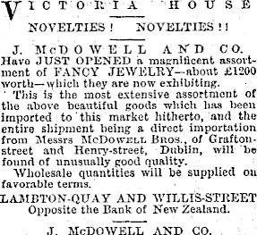 ICT O l'l A HOUSE NOVELTIES ! NOVELTIES !! J. McD OWE L L AN D CO. Have JUST OPENED a magnificent assortment of FANCY JEWELRY—about £I2OO worth—>ylhcli they are now exhibiting. ‘ This is the most extensive assortment of the above beautiful goods which has been imported to this market hitherto, and theentire shipment being a direct importation from Messrs McDowell Bros., of Graftonstreet and Henry-street, Dublin, will be found of unusually good quality. Wholesale quantities will be supplied on . favorable terms. < LAMBTON-QUAY AND WILLTS-STREET, Opposite the Bank of New Zealand. j. McDowell and go. .