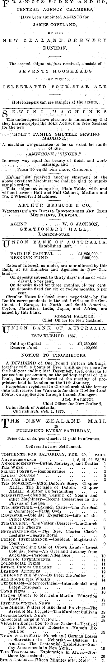 Jji R A NCI S' S I .D. E.Y AND CO, CENTRAL AGENCY CHAMBERS, Have been appointed AGENTS for JAIMES COPELAND, OF THE NEW ZEAL A N D BREWER Y, DUNEDIN. The second shipment, just received, consists of SEVENTY HOGSHEADS of the; 1 v ■■ . , CELEBRATED POUR-STAR ALE. Hotel-keepers can see samples at the agents. g E,W I N ,G ,M A C H X N E S- ■ The undersigned have pleasure in announcing that they have accepted the Sole Agency in New Zealand for the new - ,• . - , “.HOLT” FAMILY SHUTTLE SEWING MACHINE, r A machine we guarantee to be an exact fac-slmilo , ~v of-the ! , AMERICAN ; ‘ ‘ SINGER," In every way equal for beauty of finish and work- , - , ... =< manship, and . • ; From 20 iq: 25 per cent. , Cheaper. 'i, Having jiist received another shipment of the above excellent Machines, we shall be glad to supply sample orders. . This shipment comprises, Plain Table, with and without cover ; Half and Full Cabinet, Medium and No. 2 Wheel-feed Machines. ARTHUR BRISCOE & CO., Wholesale' and Retail Ironmongers and Iron ..r -■ > . Merchants, Dunedin. . AGENT .. , .. W. G. JACKSON, STATIONERS' HALL, Lambton-quay. UNION BANK OF AUSTRALIA. Established 1837. PAID-UP CAPITAL .. .. £1,250,000. ' RESERVE FUND ; .. .. £400,000. , Rates of Interest, as under, are now allowed by this Bank, at its Branches and Agencies in New;Zealand:— ' ’ ■ On deposits subject to thirty days’ notice of withdrawal, 5 per cent. On deposits fixed for three months, 5J per cent On deposits fixed for six or twelve months, 6 per cent. . r. Circular Notes for fixed sums negotiable, by the Bank's correspondents in the chief cities on the Continent of Europe, in North and South America, Ceylon, Mauritius, India, Japan, and Africa, are issued by this Bank. .. JOSEPH PALMER, - Chief Officer for New Zealand. NI O N BANK /OF AUSTRA LI A. . ESTABLISHED 1837. Paid-up Capital .. .. .. £1,250,000. Reserve Fund .. .. .. , £ 400,000. NOTICE TO PROPRIETORS. A DIVIDEND of One , Pound Fifteen Shillings, together with a bonus of Five Shillings per share for the half-year ending 31st December, 1874, equal to 1G per centum per annum, on the paid-up capital of this Bank,.having been declared at the meeting of proprietors held in London on the 11th January, Proprietors registered in Christchurch at tbo former | date will receive the Warrants for their Dividend and Bonus, on application through Brandi Managers. JOS. PALMER. Chief Officer for New Zealand. Union Bank of Australia, Christchurch. Feb. 1, 1575. nHE NEW ZEALAND MAIL U 18 , PUBLISHED EVERY SATURDAY, Price Cd., or ss. per Quarter if paid in advance. Delivered at any Settlement. CONTENTS FOR SATURDAY, FEB. 20. page. Advertisements , .. i, 2, 21. 22, 23,'24 Announcements—Births, Marriages, and Deaths i The Week .. .. 1 Select Poetry.—Remonstrance ... .. .. 3 Ladies' Column * .. s The Arm Chair 3 The Novelist.—Edith Dalton's Story. Chapter XLH.; The Bedside of Dalton. Chapter XLIIL: A Bitter Understanding .. .. S Scientific.—Scientific Testing of Steam and other Machinery—Recent Researches in the Physics of the Sea 4 The Skktciier.—Larnach Castle—Tlie Fur Seal of Commerce-Night Owls .. .. ..‘ 6 Reviewer. —Colonial Experience—Life of the 1 Prince Consort .. 0 , TheChuuch. - The Vatican Decrees—TheChurch and the Theatre .. .. 7 j Entertainments. The Rev. Charles Clark's Lectures—Theatre Royal .. ~ .. g Police Intelligence.—Resident Magistrate’s Court.. The Approaching Sale of Crown Lands—Latest Colonial News—An Overland Journey from Auckland—Personal Allegiance , .. ~ 10 Shipping Intelligence .. .. ..11 Commercial Items Retail Prices Current Leading Articles .. 12 Things by the Way—By Peter the Pedlar .. 13 , All Round the World ]4 Tklf.oramh—lnterprovincial—lntercolonial and Latest European .. 14 Town News .10 Parting Dinner to Mr. John Martin—Education Board iNTKiirnoviNCiAi. News !! 17 The Mineral Waters of Auckland Province—The Arrest of Mr. Leggett—The Murderer Sullivan 18 Intercolonial News .. .. .. lg Convicts at Large in Victoria.. .. ’* !! 18 Victorian Emigration to New Zealand—Death of the Rev. Andrew Robertson—Hume’s Expedition .. ' .. 19 News by the Mail—French and German Losses Starvation in Nebraska Distress in America—The Centennial ■ Exhibition—Sun- ' day Amusements in New York.. .. .. 19 Tub Traveller.—Exploration In Africa—Northern Queensland;., .. 20 Story-teller.—Fifteen Minutes after ''Midp'-; ' •>!