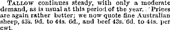 Tallow continues steady, with only a moderate demand, as is usual at this period of the year. 'Prices are again rather better; we now quote fine Australian sheep, 435. 9d. to 445. Cd., aud beef 435.'6d. to 445. per cwt.