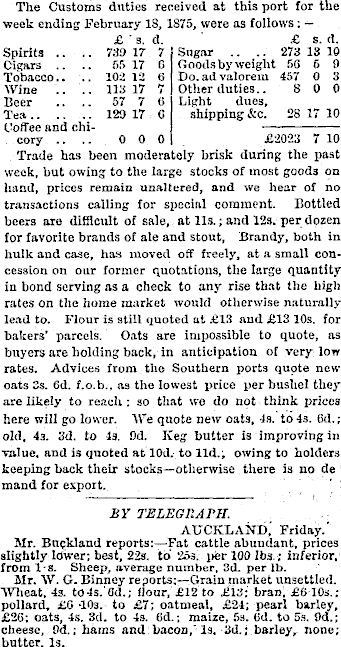 The Customs duties received at this port for the week ending February 18, 1875, were as follows; £ ’s. d. * £ s. d. Spirits .. .. 739 17 7 Sugar ~ .. 273 13 10 Cigars .. .. 55 17 G Goods by weight 56 5 9 Tobacco.. .. 102 12 6 Do.advalorem 457 0 3 Wine .. ~ 113 17 7 Other duties.. 8 0 0 Beer .. .. 57 7 C Light dues. Tea 129 17 C shipping &c. 28 17 10 Coffee and chi- . cory .. ..0 0 0 £2023 710 Trade has been moderately brisk during the past week, but owing to the large stocks of most goods on hand, prices remain unaltered, and we hear of no transactions calling for special comment. Bottled beers are difficult of sale, at 11s.; and 12s. per dozen for favorite brands of ale and stout, Brandy, both in hulk and case, has moved off freely, at a small concession on our former quotations, the large quantity in bond serving as a check to any rise that the high rates on the home market would otherwise naturally lead to. Flour is still quoted at £l3 and £l3 10s. for bakers’ parcels. Oats are impossible to quote, as buyers are holding back, in anticipation of very low rates. Advices from the Southern ports quote new oats Ss. 6d. f.0.b., ns the lowest price per bushel they are likely to reach: so that wo do not think prices here will go lower. We quote new oats, 4s. to 4s. 6d,; old, 4s. 3d. to 4s. Dd. Keg butter is improvingin value, and is quoted at lOd. to lid.; owing to holders keeping back their stocks—otherwise there is no de mand for export. ’ BY TELEGRAPH. AUCKLAND, Friday/ Mr. Bnqkland reports:—Fat cattle abundant, prices slightly lower; best, 225. to 2 53. i»er 100 lbs.; inferior, from Is. Sheep, average number, 3d. per lb. Mr. W. G. Binney reports;—Grain market unsettled. Wheat. 4s. t045.0d.; flour, £l2 to £l3; bran' £6TOs.; pollard, £G -IDs. to £7; oatmeal, £24; pearl barley, £26: oats, 4s, 3d. to 4s. 6d.; maize, ss. 6d. to ss, 9d.; cheese, 9d,; haras and bacon,'ls. 3d.; barley,. none; butter. Is.