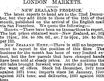 LONDOK : MARKETS. ‘ ' NEW ZEALAND PRODUCE.' : K The latest reports to band are to the 22ud December, but they add little to those of‘‘the 15th'of‘that month, published on the arrival of the English mail via San Francisco. We quote the following;—‘ ’ ■ Horn*. —There have been no transactions to report. The last prices obtained were—New Zealand, to 12|0z., 35a. to 50s. ,6’d., av,,7.t0 9|oz., 16s. to 30s. per 123. i New Zealand Hemp. —There is still no improvement to report in the position of this fibre. -The business for the month has been of very limited ex : tent, but the few parcels that have changed hands have been sold at steady prices. At the auctions the 450 bales brought forward were nearly all bought in for want of offers. Stock Ist December, 1972 tons against 1871 tons; Imports since Ist January, 1700 against 3174 tons; and deliveries,-1660.against 1668 tons.
