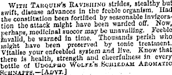 ■With Tarquih’s Eavibhi.vo stride*, stealthy but swift, disease advances In the feeble organism. Had the constitution been fortified by seasonable invlgoration the attack might have been warded off. Now, perhaps, medicinal succor may be unavailing. Feeble invalid, bo warned In time. Thousands perish who might have been preserved by tonic treatment. Vitalise your enfeebled system and live. Know that there Is health, strength and cheerfulness In every bottle of Hnou-uo woLra's Bciueoam Aromatic SOHSAJ'PB.— [Abvx.j ,
