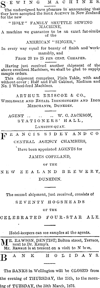 g- B. WI. N G MACHINES. The undersigned have pleasure in announcing that they have accepted the Sole Aoenoy in New Zealand for the new «HOLT" FAMILY SHUTTLE SEWING MACHINE, A machine we guarantee to be an exact fac-siraile of the AMERICAN “SINGER,” In every way equal for beauty of finish and ?workmanship, and From 20 to 25 per cent. Cheaper. Having just received another shipment of the above excellent Machines, wo shall be glad to supply sample orders. This shipment comprises. Plain Table, with and without cover ; Half and Full Cabinet, Medium and No. 2 Wheel-feed Machines. ARTHUR BRISCOE & CO., Wholesale and Retail Ironmongers and Iron Merchants, Dunedin. AGENT W. G. JACKSON, STATIONERS' HALL, Lambton-quay. P 11 A N CIS SIDEY AND CO CENTRAL AGENCY CHAMBERS, Have been appointed AGENTS for JAMES COPELAND, NEW ZEALAND BREWERY, DUNEDIN. The second shipment, just received, consists of SEVENTY HOGSHEADS OF THE CELEBRATED FOUR -STAR ALE. Hotel-keepers can see samples at the agents. TI/fR. RAWSON, DENTIST; Bolton street. Terrace, LtX next to .Dr. Kemp's. Mr. Rawaon is at present on a visit to N Is in. JgANK HO LIDAYS. The BANKS in Wellington will be CLOSED from the evening of THURSDAY, the 25th, to the morning of TUESDAY, the 30th March, 1875.