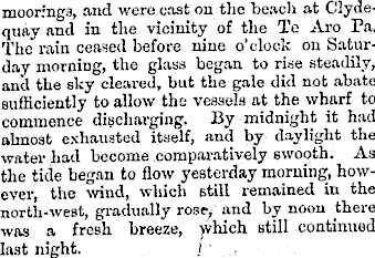 moorings, and were cast on the beach at Clydequdy and in the vicinity of the Te Aro Pa. The rain ceased before nine o’clock on Saturday morning, the glass began to rise steadily, and the sky cleared, but the gale did not abate sufficiently to allow the vessels at the wharf to commence discharging. By midnight it had almost exhausted itself, and by daylight the water had become comparatively swooth. As the tide began to flow yesterday morning, however, the wind, which still remained in the north-west, gradually rose, and by noon there was a fresh breeze, which still continued last night. I " ,