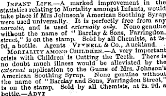 Infant Life. —A marked improvement in the statistics relating to Mortality amongst Infants, would take place if Mrs Johnson's American Soothing Syrup were used universally. It is perfectly free from any narcotic , and ie used externuliy only. None genuine without the name of “ Barclay & Sons, Farrlngdon. street," is on the stamp. Sold by all Chemists, at 2aOd, a bottle. Agents Mortality among Children.— A very Important crisis with Children is Cutting the Teeth. There is no doubt much illness would be alleviated by the external application to the Gums of. Mrs. Johnsons American Soothing Syrup. None genuine without the name of “ Barclay and Sons, Karringdou Street, Is on the stamp. Sold by all Chemists, at 2s. yd. a bottle.—Advx