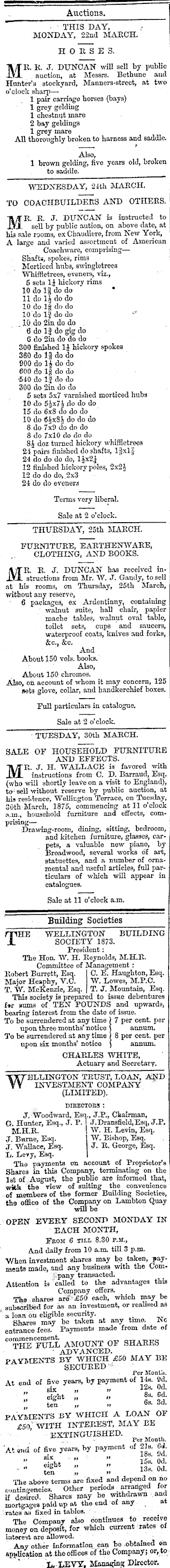 Auctions. ■ THIS DAY, MONDAY, 22nd MARCH. HORSES. MR. R. J. DUNCAN will sell by public auction, at Messrs. Bethune and Hunter's stockyard, Manners-street, at two o’clock sharp—: 1 pair carriage horses (bays) 1 grey gelding 1 chestnut mare 2 bay geldings 1 grey mare All thoroughly broken to harness and saddle. Also, 1 brown gelding, five years old, broken to saddle. WEDNESDAY, 2-Ith MARCH. TO OOACHBUILDEES AND OTHERS. MR. R. J. DUNCAN is instructed to sell by public aution, on above date, at his sale rooms, ex Chaudiere, from New York, A large and varied assortment of American Coachware, comprising— Shafts, spokes, rims Morticed hubs, swingletrees Whiffletrees, eveners, viz., 6 sets 1J hickory rims 10 do do do * 11 do i j do do 10 do Ig do do 10 do if do do *' .10 do 2in do do , 6 do 13 do gig do G do 2in do do do 300 finished 1J hickory spokes 360 do 1| do do 900 do 1J do do 600 do l| do do •540 do 15 do do 300 do 2in do do 5 sets 5x7 varnished morticed hubs 10 do 5Jx74 do do do 15 do 6xß do do do 10 do (JAxSJs do do do 8 do 7x9 do do do 8 do 7xlo do do do 8J doz turned hickory whiffletrees 24 pairs finished do shafts, IgxlJ 24 do do do do, l jx23 12 finished hickory poles, 2x21 12 do do do, .2x3 24 do do eveners Terms very liberal. Sale at 2 o’clock. THURSDAY, 25th MARCH. FURNITURE, EARTHENWARE, CLOTHING, AND BOOKS. MR. R. J. DUNCAN has received instructions from Mr. W. J. Gandy, to sell at his rooms, on Thursday, 25th March, without any reserve, 6 packages, ex Ardentinny, containing walnut suite, hall chair, papier mache tables, walnut oval table, toilet sets, cups and saucers, waterproof coats, knives and forks, &c., &c. And About 150 vols. books. Also, About 150 chromos. Also, oh account of whom it may concern, 125 sets glove, collar, and handkerchief boxes. Full particulars in catalogue, Sale at 2 o’clock. TUESDAY, 30th MARCH. SALE OF HOUSEHOLD FURNITURE AND EFFECTS. MR. J. H. WALLACE is favored with instructions from C. D. Barraud, Esq. (who will shortly leave on a visit to England), to ; sell without reserve by public auction, at Ms residence, Wellington Terrace, on Tuesday, 30th March, 1875, commencing at 11 o’clock a.m., household furniture and effects, comprising— . . Drawing-room, dining, sitting, bedroom, and kitchen furniture, glasses, carpets, a valuable new piano, by Broadwood, several works of art, statuettes, and a number of ornamental and useful articles, full particulars of which will appear in catalogues. Sale at 11 o’clock a.m. Building Societies /JIHE WELLINGTON BUILDING SOCIETY 1873. President: The Hon. W. H. Reynolds, M.H.R. Committee of Management : Robert Barrett, Esq. Major Heaphy, Y.C. T. W. McKenzie, Esq. C. E. Haughton, Esq. W. Lowes, M.F.O. T. J. Mountain, Esq. This society is prepared to issue debentures f»r sums of TEN FOUNDS and upwards, bearing interest from the date of issue. To be surrendered at anytime ) 7 per cent, per upon three months’ notice j annum. To be surrendered at any time j 8 per cent, per upon six months’ notice j annum. CHARLES WHITE, Actuary and Secretary. WELLINGTON TRUST, LOAN, AND INVESTMENT COMPANY " (LIMITED). J. Woodward, Esq., J.P., Chairman, G. Hunter, Esq., J. P. J.Dransfield,Esq, J.P, M.H.R. W. H. Levin, Esq. J. Bume, Esq. W. Bishop, Esq. J. Wallace, Esq. J. R. George, Esq. L. Levy, Esq. The payments on account of Proprietor’s Shares in this Company, terminating on the Ist of August, the public are informed that, with the view of suiting the convenience of members of the former Building Societies, the office of the Company on Lambton Quay will be OPEN EVERY SECOND MONDAY IN EACH MONTH, Feom 6 TILL 8.80 P.M., And daily from 10 a.m till 3 p.m. When investment shares may be taken, payments made, and any business with the Company transacted. Attention is called to the advantages this Company offers. The - shares are £SO each, which may be subscribed for as an investment, or realised as a loan bn eligible security. Shares may be taken at any time. No entrance fees. Payments made from date ef C °THE'PULL AMOUNT OF SHARES • ADVANCED. PAYMENTS BY WHICH £SO MAY BE SECURED 4 Per Month. At end of five years, by payment of 14s. fltl. BIX if ff UCI« ” eh'ht „ » 8a - 6dten „ Gs. 3d. PAYMENTS BY WHICH A LOAN OF £so' WITH INTEREST, MAY BE EXTINGUISHED. _ Per Month. At end of five years, by payment of 21s. Cd. ” mm ” 15* 0d! ’ " ten ” 13a ‘ 0d - The above terms are fixed and depend on no contingencies. Other periods arraiiged for if desired. Shares may bo withdrawn and mortgages paid up at the end o£ any , a ratca aa fixed in tables. • ’ • ■ ■ The Company alao continue# to receive money on deposit, for which current rates of interest are allowed. i Any other information, can bo .obtained on Application at the offices of the Company; or, to I* LEVY, Managing Director.