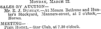 Moxday, March 22. SALES BY AUCTION— Mr. E. J. Ddscan.—At Messrs. Bethune and Hunter’s Stockyard, Manners-street, at 2 o’clock, — Horses. MEETINGPIER Hotel.—Star Club, at 7.30 o’clock.