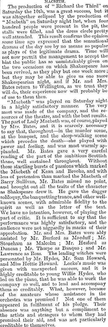 MACBETH. The production of “ Richard the Third” on Saturday the 10th, was a great success, but it was altogether eclipsed by the production of “ Macbeth” on Saturday night last, when four hundred people were present in the pit, the stalls were filled, and the dress circle pretty well attended. This result confirms the opinion some time ago expressed that the sensational dramas of the day are by no means so popular as plays of the legitimate drama. Time will not now penuit the management to accept the hint the public has so unmistakably given on the two occasions on which Shakespeare has been revived, as they play but one week more ; but they may be able to give us one more Shakespearian night, and if Mr. and Mrs. Bates return to Wellington, as wo trust they will do, their experience now will probably be of use to them then. “Macbeth” was played on Saturday night in a highly satisfactory manner. The very most was made of the company, and the resources of the theatre, and with the best results. The part of Lady Macbeth was, of course, played by Mrs. Bates, and it is scarcely, necessary to say that, throughout—in the murder scene, at the banquet, and the sleep-walking scene which precedes the death—she played with power and feeling, and wag most warmly applauded. Hr. Bates gave a very careful reading of the part of the ambitious Scottish thane, well sustained throughout. Without those startling bursts of passions which marked the Macbeth of Kean and Brooke, and with less of pretension than marked the Macbeth of Barry .Sullivan, Mr. Bates missed no point, and brought out all the traits of the character as Shakspeare drew it. He gave the dagger soliloquy, the banquetting trance, and other wellknown scenes, with admirable fidelity to the spirit as well as the letter of the text. We have no intention, however, of playing the part of critic. It is sufficient to say that the performance was highly satisfactory, and the audience were not niggardly in marks of their approbation. Mr. and Mrs. Bates were ably assisted by Mr, Burford as Macduff; Mr. Stoneham as Malcolm ; Mr. Hesford as Duncan ; Mr. Thorpe as Banquo ; and Mr. Lawrence as Ross. The leading witches were personated by Mr. Hydes, Mr. Sam Howard, and Miss Hettie Howard. Locke’s music was given with unexpected success, and it is highly creditable to young Willie Hydes, who led on the piano, that he was able to work the company so well, and to lead and accompany them so creditably. What, however, became of the amateurs whose assistance in the orchestra was promised ? Not one of them appeared in fulfilment of his pledge. Their absence was anything but a compliment to the artists and strangers to whom they had promised their aid, and was not particularly creditable to themselves.
