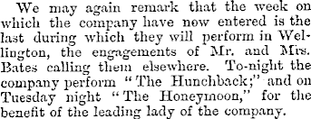 We may again remark that the week on which the company have now entered is the last during which they will perform in Wellington, the engagements of Mx*. and Mi’s. Bates calling them elsewhere. To-night the company perform “The Hunchback;” and on Tuesday night “The Honeymoon,” for the benefit of the leading lady of the company.