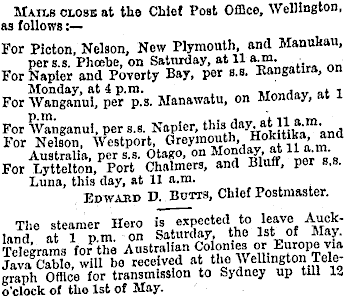 Mails close at the Chief Post Office, Wellington, as follows : For Picton, Nelson, New Plymouth, and Manukau, per s.s. Phcebe, on Saturday, at 11 <"»•.■, For Napier and Poverty Bay, per s.s. Rangatira, on Monday, at 4 p.m. ~„,,„ „ t ■• For Wanganui, per p.s. Manawatu, on Monday, at 1 For W™nganui, per s.s. Napier, * h H day. J 1 a - m - . For Nelson, Westport, Greymouth Hoktika Australia, per s.s. Otago, on Monday, at 11a.m. For Lyttelton, Port Chalmers, and Bluff, per s.s. Luna, this day, at 11 a.m. Edward D. Butts, Chief Postmaster. The steamer Hero iJ^P^^'lv' 0 A? ™ f land at 1 pm. on Saturday, the Ist of May. Te&rams for the Australian Colonies or Europe via Sva g Cablo,wiU bo received at the Wellington Telegraph Office for transmission to Sydney up till 12 o'clock of tho Ist of May. '