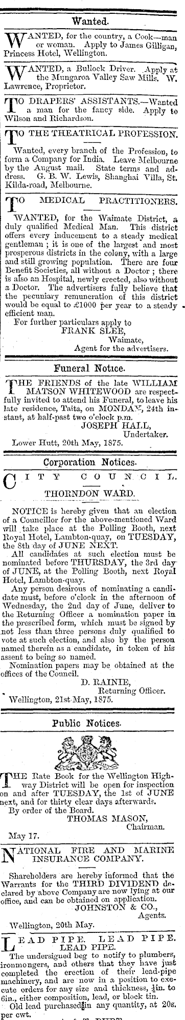 Wanted. WANTED, for the country, a Cook—man or woman. Apply to James Gilligan, Princess Hotel, Wellington. ANTED, a Bullock Driver. .Apply at the Mungaroa Valley Saw Mills. W. Lawrence, Proprietor. O DRAPERS’ ASSISTANTS.—Wanted a man for the fancy side. Apply to Wilson and Richardson. rjTTO THE THEATRICAL PROFESSION. Wanted, every branch of the Profession, to form a Company for India. Leave Melbourne by the August mail. State terms and address. G-. B. W. Lewis, Shanghai Villa, St, Kilda-road, Melbourne. ''£'o MEDICAL PRACTITIONERS. WANTED, for the Waimate District, a, duly qualified Medical Man. This district offers every inducement to a steady medical gentleman ; it is one of the largest and most prosperous districts in the colony, with a large and still growing population. There are four Benefit Societies, all without a Doctor ; there is atso an Hospital, newly erected, also without a Doctor. The advertisers fully believe that the pecuniary remuneration of this district would be equal to £IOOO per year to a steady efficient man. For further particulars apply to FRANK SLEE, Waimate, Agent for the advertisers. Funeral Notice. THE FRIENDS of the late WILLIAM MATSON WHITBWOOD are respectfully invited to attend his Funeral, to leave his late residence, Taita, on MONDAV, 24th instant, at half-past two o’clock p.m. JOSEPH HALL, Undertaker. Lower Hutt, 20th May, 1875. Corporation NoticesQI T V COUN CI L. THOENDONWARD. NOTICE is hereby given that an election of a Councillor for the above-mentioned Ward will take place at the Polling Booth, next Royal Hotel, Lambton-quay, on TUESDAY, the Sth day of JUNE NEXT. . All candidates at such ejection must be nominated before THURSDAY, the 3rd day of JUNE, at the Polling Booth, next Royal Hotel, Lambton-quay. Any person desirous of nominating a candidate must, before o’clock in the afternoon of Wednesday, the 2nd day of June, deliver to the Returning Officer a nomination paper in the prescribed form, which must be signed by not less than three persons duly qualified to vote at such election, and also by the person named therein as a candidate, in token of his assent to being so named. Nomination papers may be obtained at the offices of the Council. D. RAINIE, . Returning Officer. Wellington, 21st May, 1875. Public Notices. THE Rate Book for the Wellington Highway District will be open for inspection on and after TUESDAY, the Ist of JUNE next, and for thirty clear days afterwards. By order of the Board. THOMAS MASON, Chairman. May 17. National fire and marine INSURANCE COMPANY. Shareholders are hereby informed that the Warrants for the THIRD DIVIDEND declared by above Company are now lying at our office, and can be obtained on application. JOHNSTON & CO., Agents. Wellington, 20th May. BAD PIPE. LEAD PIPE. J LEAD PIPE. The undersigned beg to notify to plumbers, inmongers, and others that they have just mpleted the erection of their lead-pipe ichinery, and are now in a position to exete orders for any size and thickness, to i., either composition, lead, or block tin. Old lead purchased|in any quantity, at 20s. r owt.