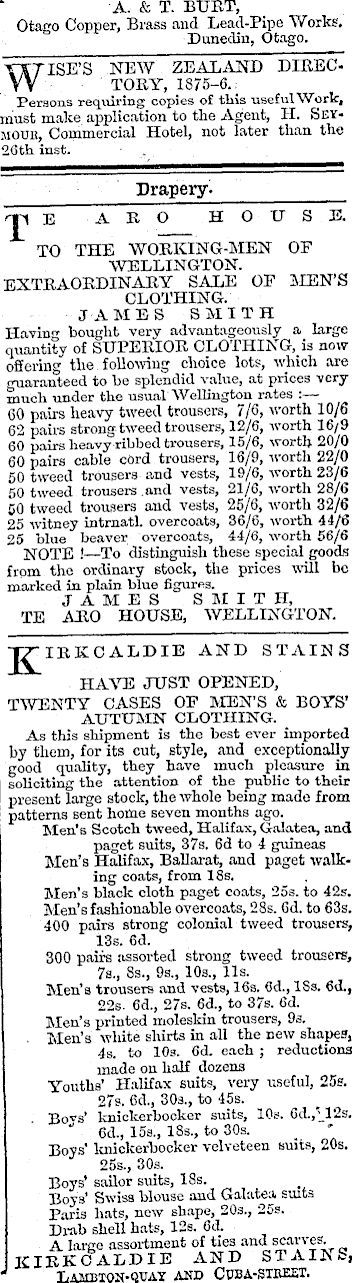 A. & T. BUBT, Otago Copper, Brass and Lead-Pipe Works. Dunedin, Otago. ISE’S NEW ZEALAND DIBECTOBY, 1875-6.: Persons requiring copies of tills useful Work, must make application to the Agent, 11. &EYjiour, Commercial Hotel, not later than the 26th lust. ■ . Drapery. 'JIE ABO HOUSE. TO THE WOBKING-MEN OF WELLINGTON. EXTBAOBDINABY SALE OF MEN’S CLOTHING. JAMES SMITH Having bought very advantageously a large quantity of SUPEBIOB CLOTHXN G, is now offering the following choice lots, which are truaranteed to be splendid value, at prices very much under the usual Wellington rates : 60 pairs heavy tweed trousers, 7/6, worth 10/6 62 pairs strong tweed trousers, 12/6, worth 16/9 60 pairs heavy ribbed trousers, 15/6, worth 20/0 60 pairs cable cord trousers, 16/9, worth 22/0 50 tweed trousers and vests, 19/6, worth 23/6 50 tweed trousers .and vests, 21/6, worth 28/6 CO tweed trousers and vests, 25/6, worth 32/6 25 witney intmath overcoats, 36/6, worth 44/6 25 blue beaver overcoats, 44/6, worth 56/6 NOTE ! —To distinguish these special goods from the ordinary stock, the prices will be marked in plain blue figures. JAMES SMITH, TE ABO HOUSE, WELLINGTON. K IBKCALDIE AND STAINS HAVE JUST OPENED, TWENTY CASES OF MEN’S & BOYS’ AUTUMN CLOTHING. _ As this shipment is the best ever imported by them, for its cut, style, and exceptionally good quality, they have much pleasure in soliciting the attention of the public to their present large stock, the whole being made from patterns sent home seven months ago. Men’s Scotch tweed, Halifax, Galatea, and paget suits, 375. 6d to 4 guineas Men’s Halifax, Ballarat, and paget walking coats, from 18s. Men’s black clotb paget coats, 255. to 425. Men’s fashionable overcoats, 28s. Cd. to 635. 400 pairs strong colonial tweed trousers, 13s. 6d. 300 pairs assorted strong tweed trousers, 75., Bs., 95., 10s., 11s. Men’s trousers and vests, 16s. 6d., ISs. 6d., 225. 6d., 275. 6d., to 375. 6d. Men’s printed moleskin trousers, 9s. . Men’s white shirts in all the new shapes, 4s. to 10s. 6d. each ; reductions made on half dozens Youths’ Halifax suits, very useful, 255. 275. 6d., 305., to 455. . Bovs’ knickerhocker suits, 10s. Cd.,‘l2s. " 6d., 155., 18s., to 30s. Boys’ knickerhocker velveteen suits, 20s. 255., 80s. Boys’ sailor suits, 18s. Boys’ Swiss blouse and Galatea suits Paris hats, new shape, 205., 255. Drab shell hats, 12e. Cd. A large assortment of ties and scarves. KIBKCALDIE AND STAINS, Lambioh-quay AND COTA-SXXUSET.