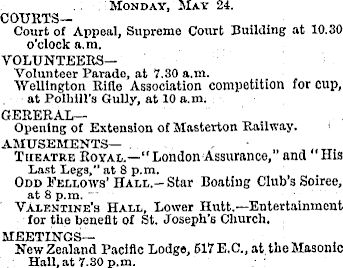 Monday, May 24. COURTSCourt of Appeal, Supreme Court Building at 10.30 o’clock a. m. VOLUNTEERSVolunteer Parade, at 7.30 a.m. Wellington Rifle Association competition for cup, . at Polhill’s Gully, at 10 a.m. GERERAL— Opening of Extension of Masterton Railway. ■ AMUSEMENTS—. , Theatre Royal.—-“ London Assurance,” and His Last Legs," at 8 p.m. Odd Fellows’Hall.—Star Boating Club’s Soiree, at 8 p.m. Valentine’s Hall, Lower Hutt, —Entertainment for the benefit of St. Joseph’s Church. MEETINGS— New Zealand Pacific Lodge, 617E.C., at. the Masonic Hall, at 7.30 p.m.
