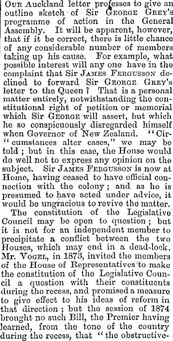 Our Auckland letter professes to give an outline sketch of Sir George Grey’s programme of action in the General Assembly. It will be apparent, however, that if it be correct, there is little chance of any considerable number of members taking up his cause. For example, what possible interest will any one have in the complaint that Sir Jambs Fjerousson declined to forward Sir George Grey’s letter to the Queen 1 That is a personal matter entirely, notwithstanding tho constitutional right of petition or memorial which Sir George will assert, but which he so conspicuously disregarded himself when Governor of New Zealand. “Cir- “ cumstances alter cases,” wo may be told ; but in this case, the House would do well not to express any opinion on the subject. Sir James Fergusson is now at Home, having ceased to have official connection with the colony; and as he is presumed to have acted under advice, it would be ungracious to revive the matter. Tho constitution of the Legislative Council may be open to question ; but it is not for an independent member to precipitate a conflict between the two Houses, which may end in a dead-look. Mr. Yooel, in 1873, invited the members of the House of Representatives'to make the constitution of the Legislative Council a question with their constituents during tho recess, and promised a measure to give effect to his ideas of reform in that direction ; but tho session of 1874 brought no such Bill, tho Premier having learned, from tho tone of the country during the recess, that “ the obstructive-