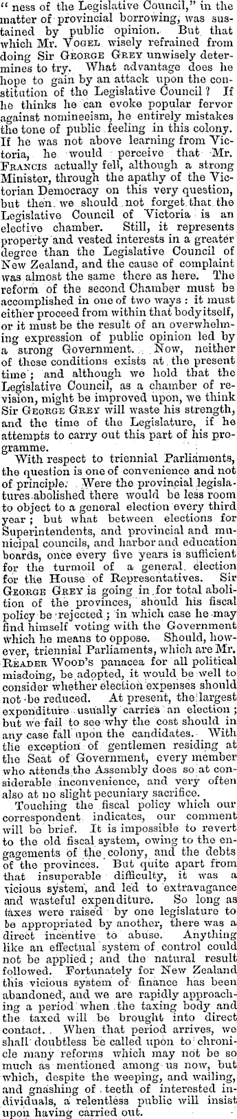 “ ness of tlie Legislative Council,” in the matter of provincial borrowing, was sustained by public opinion. But that which Mr. Vogel wisely refrained from doing Sir George Grey unwisely determines to try, What advantage does he hope to gain by an attack upon the constitution of the Legislative Council ? If he thinks he can evoke popular fervor against nomineeism, he entirely mistakes the tone of public feeling in this colony. If he was not above learning from Victoria, he would r perceive that Mr. Francis actually fell, although a strong Minister, through the apathy of the Victorian Democracy on this very question, but then, we should not forget, that the Legislative Council of Victoria - is an elective chamber. Still, it represents property and vested interests in a greater degree than the Legislative Council of New Zealand, and the cause of complaint was almost the same there as here. The refoi’rn of the second Chamber must be accomplished in one of two ways : it must either proceed from within that bodyitself, or it must be the result of an overwhelming expression of public opinion led by a strong Government.; Now, neither of these conditions exists at, the present time'; and although we hold that the Legislative Council, as a chamber of revision, might be improved upon, we think Sir George Grey will waste his strength, and the time of the Legislature, if he attempts to carry out this part of his pro- ■ gramme. ; With respect to triennial Parliaments, the question is one of convenience and not of principle; . Were the provincial legislatures abolished there would be less room to object to a general election every third year ; but what between elections for Superintendents, and provincial and municipal councils, and harbor and education boards, once every five years is sufficient for the turmoil of a general, election for the House of Representatives. Sir George Grey is going in,for total abolition of the provinces,' should his fiscal policy be rejected.; in which case he may find himself voting with the Government which he means to oppose. Should, however, triennial Parliaments, which are Mr. Reader Wood’s panacea for all political misdoing, be adopted, it would be well to consider whether electiofi expenses should not’be reduced. At present, the largest expenditure usually carries an election; but we fail to see why the cost should in any case fall upon the candidates. With the exception of gentlemen residing at the Seat of Government, every member who attends the Assembly does so at considerable inconvenience, and very often also at no slight pecuniary sacrifice. Touching the fiscal policy which our correspondent, indicates, our comment will be brief. It is impossible to revert to the old fiscal system, owing to the engagements of the. colony, and the debts of the provinces. ' But quite apart from that insuperable difficulty, it was a vicious system, and led to extravagance and wasteful expenditure. So long as faxes were raised by one legislature to be appropriated by another, there was a: direct incentive to abuse. Anything like an effectual system of control could not be applied; and the natural result followed. Fortunately for New Zealand this vicious system of finance has been abandoned, and we are rapidly approaching a period when .the taxing body and the taxed will be brought into direct contact. . When that period arrives, we shall'doubtless be called upon to; chronicle many reforms which may not be so much as mentioned among us now, but which, despite the weeping, and wailing, and gnashing of . teeth of interested individuals, a relentless public will insist upon having carried out.