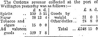 The Customs revenue collected at the port of Wellington yesterday was as follows; £ s. cl. £ s, d. Spirits .. 130 5 11 Goods by Sugar .. 18 13 4 weight .. 31 0 1 Tobacco and Other duties.. 24 8 0 cigars .. 15 0 0 Ad valorem Total .. £548 15 0. goods .. 329 7 8