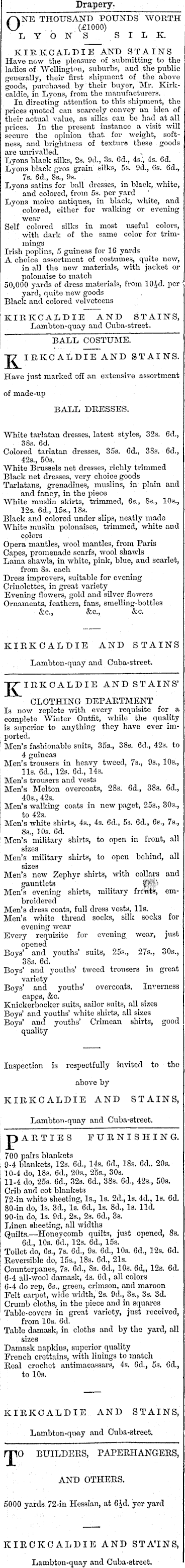 Drapery. NE THOUSAND POUNDS WORTH (£1000) LYONS SILK. KIRKCALDIE AND STAINS Have now the pleasure of submitting to the ladies of Wellington, suburbs, and the public generally, their first shipment of the above goods, purchased by their buyer, Mr. Kirkcaldie, in Lyons, from the manufacturers. In directing attention to this shipment, the prices quoted can scarcely convey an idea of their actual value, as silks can be had at all prices. In the present instance a : visit will secure the opinion that, for weight, softness, and brightness of texture these goods are unrivalled. Lyons black silks, 2s. 9d., 3s. 6d., 4s.', 4s. 6d. Lyons black gros grain silks, ss. 9d., 6s. fid., 7s. 6d., Ss., 9a. Lyons satins for ball dresses, in black, white, and colored, from ss. per yard Lyons moire antiques, in black, white, and colored, either for walking or evening wear Self colored silks in most useful colors, with dark of the same color for trimmings Irish poplins, 5 guineas for 16 yards A choice assortment of costumes, quite new, in all the new materials, with jacket or polonaise to match 50,000 yards of dress materials, from 101 d. per ■ yard, quite new goods Black and colored velveteens KIRKCALDIE AND STAINS, Lambton-quay and Cuba-street. K BALL COSTUME. IRKC ALDIE AND STAINS. Have just marked off an extensive assortment of made-up BALL DKESSES. White tarlatan dresses, latest styles, 325. 6d., 38s. 6d. Colored tarlatan dresses, 355. fid., 38s. 6d., 425., 50s. White Brussels net dresses, richly trimmed Black net dresses, very choice goods Tarlatans, grenadines, muslins, in plain and and fancy, in the piece White muslin skirts, trimmed, 65., Ss., 10s., 12s. 6d., 155., 18s. Black and colored under slips, neatly made White muslin polonaises, trimmed, white and colors Opera mantles, wool mantles, from Paris Capes, promenade scarfs, wool shawls Lama shawls, in white, pink, blue, and scarlet, from Bs. each Dress improvers, suitable for evening Crinolettes, in great variety Evening flowers, gold and silver flowers Ornaments, feathers, fans, smelling-bottles &e., &0., &c. KIRKCALDIE AND STAINS Lambton-quay and Cuba-street. Jg" lEKCALDIE AND STAINS’ CLOTHING DEPARTMENT Is now replete with every requisite for a complete Winter Outfit, while the quality is superior to anything they have ever imported. Men’s fashionable suits, 355., 38s. 6d., 425. to 4 guineas Men’s trousers in heavy tweed, 75., 95., 10s., lls. fid., 12s. fid., 14s. Men’s trousers and vests Men’s Melton overcoats, 28s. fid., 38s. fid., 405., 425. Men’s walking coats in new paget, 255., 305., to 425. Men’s white shirts, 45., 4s. fid., ss. fid., 65., 75., 8s„ 10s. fid. Men’s military shirts, to open in front, all sizes Men’s military shirts, to open behind, all sizes Men’s new Zephyr shirts, with collars and gauntlets Men’s evening shirts, military fronts, embroidered Men’s dress coats, full dress vests, lls. Men’s white thread socks, silk socks for evening wear Every requisite for evening wear, just opened Boys’ and youths’ suits, 255., 275., 30a., 38s. fid. Boys’ and youths’ tweed trousers in great variety Boys’ and youths’ overcoats. Inverness capps, &c. Knickerbocker suits, sailor suits, all sizes Boys’ and youths' white shirts, all sizes Boys’ and youths’ Crimean shirts, good quality Inspection is respectfully invited to the above by KIRKCALDIE AND STAINS, Lambton-quay and Cuba-street. JpAETIES FURNISHING. 700 pairs blankets 9- blankets, 12s. fid., 14s. fid., 18s. fid.. 20s. 10- do, 18s. fid., 205., 255., 80s. 11- do, 255. fid., 325. fid., 38s. fid., 425., 50s. Crib and cot blankets 72-in white sheeting, Is., Is. 2d., Is. 4d., Is. fid. 80-in do, Is. 3d., Is. fid., Is. Bd., Is. lid. 90-in do, Is. 9d,, 25., 2s. fid., Ss. Linen sheeting, all widths Quilts. —Honeycomb quilts, just opened, Bs. fid., 10s. fid., 12s. fid., 15s. Toilet do, Cs., 7s. 6d., 9s. fid., 10a. fid., 12s. fid. Reversible do, 155., 18s. fid., 21s. Counterpanes, 7s. fid., Bs. fid., 10s. fid,, 12s. fid. 0-4 all-wool damask, 4s. fid, all colors 6-4 do rep, fis., green, crimson, and maroon Felt carpet, wide width, 2s. 9d., 35., 3s. 3d. Crumb cloths, in the piece and in squares Table-covers in great variety, just received, from 10s. fid. Table damask, in cloths and by the yard, all . sizes Damask napkins, superior quality French crettains, with linings to match Real crochet antimacassars, 4s. fid., ss. fid., to 10s. KIRKCALDIE AND STAINS, Lambton-quay and Cuba-street. T o BUILDERS, PAPEEHANGERS, AND OTHERS. 5000 yards 72-in Hessian, at fijd. yer yard KIECKCALDIE AND STAINS, Lambton-quay and Cuba-street.