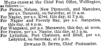Mails close at the Chief Post Office, Wellington, as fouows:— For Picton, Nelson. New Plymouth, and Manukau, per s.s. Taranaki, on Saturday, at 11 a.m. For Napier, per s.s. Kiwi, this day, at 2 p.m. For Napier and Poverty Bay, per s.s. Rangatira, this day, at 4 p.m. For "Wangaaui, per p.s. Manawatu, this day, at noon. For Foxton, per s.s. Napier, this dav, at 1 p.m. For Lyttelton, Port Chalmers, and Bluff, per s.s. Ladybird, on Saturday, at 5 p.m. Edward D. Butts, Chief Postmaster.