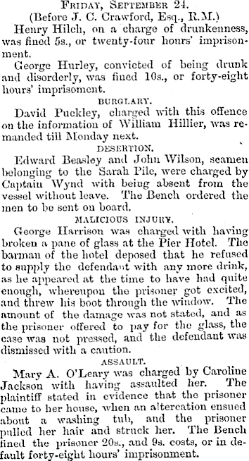 Friday, September 24. (Before J. C. Crawford, Esq., 11. M.) Henry Hilcli, on a charge of drunkenness, was fined 55., or twenty-four hours’ imprisonment. George Hurley, convicted of being drunk and disorderly, was fined 10s., or forty-eight hours' impriaomont. BURG I. ARY. David Puckley, charged with this offence on the information of William Hillier, was remanded till Monday next. DESERTION. Edward Beasley and John Wilson, seamen belonging to the Sarah Pile, were charged by Captain Wynd with being absent from the vessel without leave. The Bench ordered the men to bo sent on board. MALICIOUS INJURY. George Hai'rison was charged with having broken a pane of glass at the Pier Hotel. The barman of the hotel deposed that he refused to supply tho defendant with any more drink, as he appeared at the time to have had quite enough, whereupon the prisoner got excited, and threw his boot through the window. The amount of the damage was not stated, and as the prisoner offered to pay for the glass, the case waa not pressed, and the defendant was dismissed with a caution. assault. Mary A. O’Leary was charged by Caroline Jackson with having assaulted her. The plaintiff stated in evidence that the prisoner came to her house, when an altercation ensued about a washing tub, and the prisoner pulled her hair and struck her. The Bench fined the prisoner 205., and 9a. coats, or in default forty-eight hours’ imprisonment.