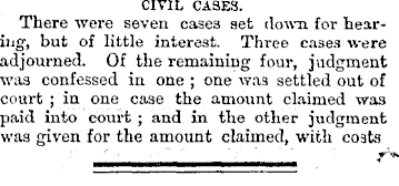 CIVIL CASES. There were seven cases set down for hearing, but of little interest. Three cases were adjourned. Of the remaining four, judgment was confessed in one ; one was settled out of court ; in one case the amount claimed was paid into court ; and in the other judgment was given for the amount claimed, with coats