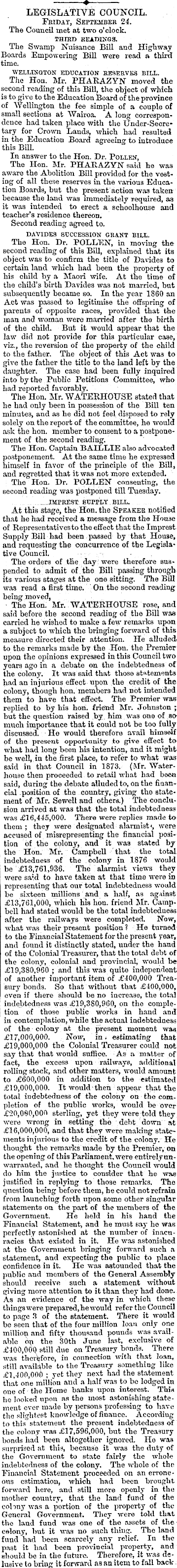 LEGISLATIVE COUNCIL. Friday, September 24. The Council met at two o’clock. THIRD READINGS. The Swamp Nuisance Bill and Highway Boards Empowering Bill were read a third time. WELLINGTON EDUCATION RESERVES BILL. Tlie Hon. Mr. PHARAZYN moved the second reading of this Bill, the object of which is to give to the Education Board of the province of Wellington the fee simple of a couple of small sections at Wairoa. A long correspondence had taken place with the Under-Secre-tary for Crown Lands, which had resulted in the Education Board agreeing to introduce this Bill. In answer to the Hon. Dr. Pollen, The Hon. Mr. PHARAZYN said he was aware the Abolition Bill provided for the vesting of all these reserves in the various Education Boards, but the present action was taken because the land was immediately required, as it was intended to erect a schoolhouse and teacher’s residence thereon. Second reading agreed to. DAVIDE 3 SUCCESSION GRANT BILL. The Hon. Dr. POLLEN, in moving the second reading of this Bill, explained that its object was to confirm the title of Davides to certain land which had been the property of his child by a Maori wife. At the time of the child’s birth Davides was not married, but subsequently became so. In the year 1860 an Act was passed to legitimise the offspring of parents of opposite races, provided that the man and woman were married after the birth of the child. But it would appear that the law did not provide for this particular case, viz., the reversion of the property of the child to the father. The object of this Act was to give the father the title to the land left by the daughter. The case had been fully inquired into by the Public Petitions Committee, who had reported favorably. The Hon. Mr. WATERHOUSE stated that he had only been in possession of the Bill ten minutes, and as he did not feel disposed to rely solely on the report of the committee, he would ask the hon. member to consent to a postponement of the second reading. The Hon. Captain BAILLIE also advocated postponement. At the same time he expressed himself in favor of the principle of the Bill, and regretted that it was not more extended. The Hon. Dr. POLLEN consenting, the second reading was postponed till Tuesday. ...IMPREST SUPPLY BILL. At this stage, the Hon. the Speaker notified that he had received a message from the Honse of Representatives to the effect that the Imprest Supply Bill had been passed by that House, and requesting the concurrence of the Legislative Council. ; The orders of tlie day were therefore suspended to admit of . the Bill passing through its various stages at the one sitting. The Bill was read a first time. On the second reading being moved, ■ The Hon. Mr. WATERHOUSE rose, and said before the second reading of the Bill was carried he wished to make a few remarks upon a subject to which the bringing forward of this measure directed their attention. He alluded to the remarks made by the Hon. the Premier upon the opinions expressed in this Council two years ago in a debate on the indebtedness of the colony. It was said that those statements had an injurious effect upon the credit of the colony, though hon. members had not intended them to have that effect. The Premier was replied to by his hon. friend Mr. Johnston ; but the question raised by. him was one of somuch importance that it could not be too fully discussed. He would therefore avail himself of the present opportunity to give effect towhat had long been his intention, and it might be well, in the first place, to refer to what was said in that Council in 1873. (Mr. Waterhouse then proceeded to retail what had been said, during the debate alluded to, on the financial position of the country, giving the statement of Mr. Sewell and others.) The conclusion arrived at was that the total indebtedness was £16,445,000. There were replies made to them; they were designated alarmist % were accused of misrepresenting the financial position of the colony, and it was stated by the Hon. Mr. Campbell that the total indebtedness of the colony in 1876 would be £13,761,936. The alarmist views they were said to have taken at that time were in representing that our total indebtedness would be sixteen millions and a half, as against £13,761,000, which his hon. friend Mr. Campbell had stated would be the total indebtedness after the railways were completed. Now, what was their present position ? He turned to the Financial Statement for the present year, and found it distinctly stated, under the hand of the Colonial Treasurer, that the total debt of the colony, colonial and provincial, would be' £19,380,960 ; and this was quite independent of another important item of £400,000 Treasury bonds. So that without that £400,000, even if there should be no increase, the total indebtedness was £19,380,960, on tho completion of those public works in hand and in contemplation, while the actual indebtedness of the colony at the present moment was £17,000,000. Now, in* estimating that £19,000,000 the Colonial Treasurer could not say that that would suffice. As a matter of fact, the excess upon railways, additional rolling stock, and other matters, would amount to £600,000 in addition to the estimated £19,000,000. It would then appear that the total indebtedness of the colony on the completion of the public works, would be over £20,090,000 sterling, yet they were told they were wrong in setting the debt down at £16,000,000, and that they were making statements injurious to the credit of the colony. He thought the remarks made by the Premier, on the opening of this Parliament, were entirelynnwarranted, and he thought the Council would do him the justice to consider that he was justified in replying to those remarks. Tho question being before them, he could not refrain from launching forth upon some other singular statements on the part of the members of the Government. He held in his hand the Financial Statement, and he must say ho was 