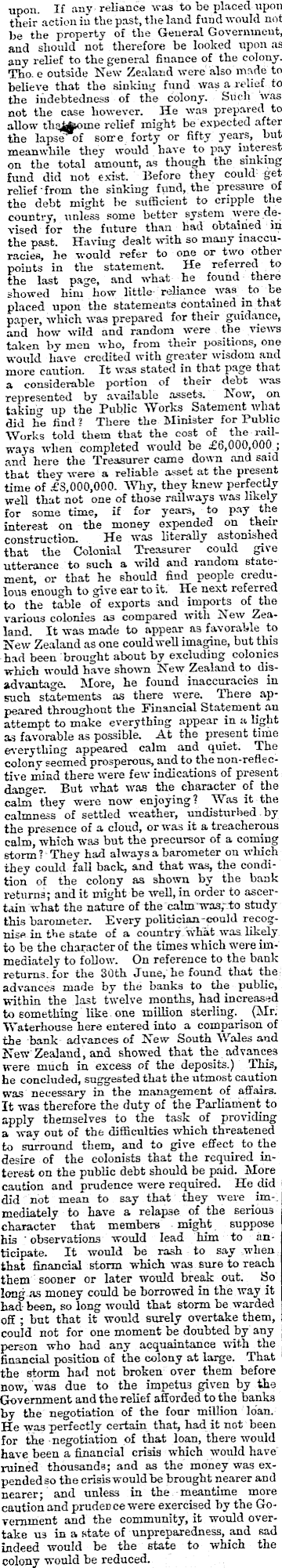 upon. If any reliance was to be placed upon their action in the past, the land fund would not be the property of the General Government, and should not therefore be looked upon as any relief to the general finance of the colony. Tho. e outside New Zealand were also made to believe that the sinking fund was a relief to, the indebtedness of the colony. Such was not the case however. lie was prepared to allow relief might be expected after the lapse s*of 5 *of some forty or fifty years, but meanwhile they would have to pay interest on the total amount, as though the sinking fund did not exist. Before they could get relief’from the sinking fund, the pressure of the debt might be sufficient to cripple the country, unless some better system were devised for the future than had obtained in the past. Having dealt with so many inaccuracies, he would refer to one or two other points in the statement. He referred to the last page, and what he found there showed bim° how little reliance was to be placed upon the statements contained in that paper, which was prepared for their guidance, and how wild and random were the views taken by men who, from their positions, one would have credited with greater wisdom and more caution. Xt was stated in that page that a considerable portion of their debt was represented by available assets. K ow, on takin" up the Public Works Satement what did he find? There the Minister for Public Works told them that the cost of the railways when completed would be £6,000,000 ; and here the Treasurer came down and said that they were a reliable asset at the present time of £3,000,000. Why, they knew perfectly well that not one of those railways was likely for some time, if for years, to pay the interest on the money expended on their construction. Ho was literally astonished that the Colonial Treasurer could give utterance to such a wild and random statement, or that he should find people credulous enough to give ear to it. He next referred to the table of exports and imports of the various colonies as compared with New Zealand. It was made to appear as favorable to New Zealand as one could well imagine, but this had been brought about by excluding colonies •which would have shown New Zealand to disadvantage. More, he found inaccuracies in such statements as there were. There appeared throughout the Financial Statement an attempt to make everything appear in a light as favorable as possible. At the present time everything appeared calm and quiet. The colony seemed prosperous, and to the nou-reflec-tive mind there were few indications of present danger. But what was the character of the calm they were now enjoying? Was it the calmness of settled weather, undisturbed by the presence of a cloud, or was it a treacherous calm, which was but the precursor of a coming storm? They had always a barometer on which they could fall back, and that was, the condition of the colony as shown by the bank returns; and it might be well, in order to ascertain what the nature of the calm was, to study this barometer. Every politician-could recognise in the state of a country, whht . was likely to be the character of the times which were immediately to follow. On reference to the bank returns, for the 30th June, he found that the: advances made by the banks to the public, within the last twelve months, had increased to something like one million sterling. (Mr. Waterhouse here entered into a comparison of the bank advances of New South Wales and New Zealand, and showed that the advances were much in excess of the deposits.) This, he concluded, suggested that the utmost caution was necessary in the management of affairs. It was therefore the duty of the Parliament to apply themselves to the task of providing a way out of the difficulties which threatened to surround them, and to give effect to the desire of the colonists that the required interest on the public debt should be paid. More caution and prudence were required. He did did not mean to say that they were im-. mediately to have a relapse of the serious character that members might suppose his observations would lead him to anticipate. It would be rash to say when that financial storm which was sure to reach them sooner or later would break out. Bo long as money could be borrowed in the way it had been, so long would that storm he warded off ; hut that it would surely overtake them, could not for one moment be doubted by any person who bad any acquaintance with the financial position of the colony at large. That the storm had not broken over them before now, was due to the impetus given by the Government and the relief afforded to the banks by the negotiation of the four million loan. He was perfectly certain that, had it not been for the negotiation of that loan, there would have been a financial crisis which would have ruined thousands; and as the money was expendedso the orisiswouldbe brought nearer and nearer; and unless in the meantime more caution and pruden oe were exercised by the Government and tbe community, it would overtake us in a state of unpreparedness, and sad indeed would be the state to which the colony would be reduced.