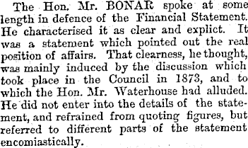 The Hon. Mr. BONAR spoke at some length in defence of the Financial Statement. He characterised it as clear and explict. It was a statement which pointed out the real position of affairs. That clearness, he thought, was mainly induced by the discussion which took place in the Council in 1873, and to which the Hon. Mr. Waterhouse had alluded. He did not enter into the details of the statement, and refrained from quoting figures, but referred to different parts of the statement encomiastically.