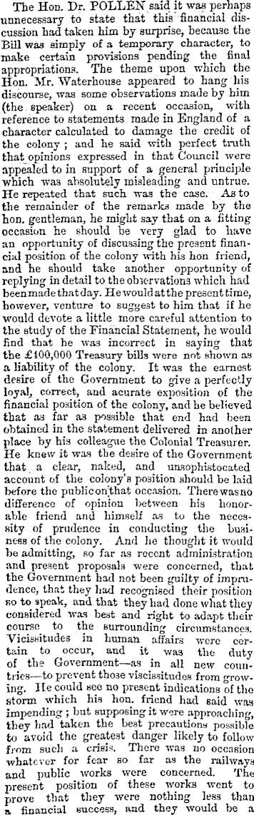 Tbe Hon. Dr. POLLEN said it was perhaps unnecessary to state that this'financial discussion had taken him by surprise, because the Bill was simply of a temporary character, to make certain provisions pending the final appropriations. The theme upon which the Hon. Mr. Waterhouse appeared to hang his discourse, was some observations made by him (the speaker) on a recent occasion, with reference to statements made in England of a character calculated to damage the credit of the colony ; and he said with perfect truth that opinions expressed in that Council were appealed to in support of a general principle which was absolutely misleading and untrue. He repeated that such was the case. As to the remainder of the remarks made by the hon. gentleman, he might say that on a fitting occasion he should be very glad to have an opportunity of discussing the present financial position of the colony with his hon friend, and he should take another opportunity of replying in detail to the observations which had beenmade that day. He would at the present time, however, venture to suggest to him that if he would devote a little more careful attention to the study of the Financial Statement, he would find that he was incorrect in saying that the £400,000 Treasury bills were not shown as a liability of the colony. It was the earnest desire of the Government to give a perfectly loyal, correct, and acurate exposition of the financial position of the colony, and he believed that as far as possible that end had been obtained in the statement delivered in another place by bis colleague the Colonial Treasurer. He knew it was the desire of the Government that a clear, naked, and unsophistocated account of the colony’s position should be laid before the public onthat occasion. There was no difference of opinion between his honorable friend and himself as to the necessity of prudence in conducting the business of the colony. And he thought it would be admitting, so far as recent administration and present proposals were concerned, that the Government had not been guilty of imprudence, that they had recognised their position so to speak, and that they had done what they considered was best and right to adapt their course to the surrounding circumstances. Vicissitudes in human affairs were certain to occur, and it was the duty of the Government—as in all new countries—to prevent those viscissitudes from growing. He could see no present indications of tho storm which his hon. friend had said was impending ; but supposing it wore approaching, they had taken the best precautions possible to avoid the greatest danger likely to follow from such a crisis. There was no occasion whatever for fear so far as the railways and public works were concerned. The present position of these works went to prove that tiiey were nothing less than a financial success, and they would be a