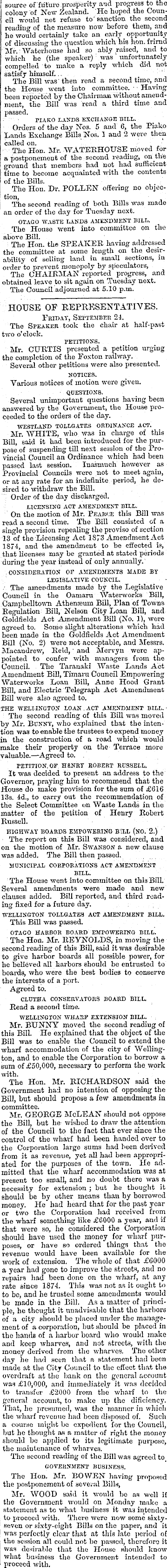 source of future prosperity and progress to the colony of New Zealand. Ho hoped the Council would not refuse to - sanction the second reading of the measure now before them, and he would certainly take an early opportunity of discussing the question which his hon.frimd Mr.: Waterhouse had so ably raised, and to which he (the speaker) : was ’ unfortunately compelled to make a reply which did not satisfy himself. The Bill was’ then read a second time, and the House went into committee. ■ ■ Having been reported by the Chairman without amendment, the Bill was read a third time and passed. PIAKO LANDS EXCHANGE BILL. Orders of the day Nos. 5 and 6, the Biako Bands Exchange Bills Nos. 1 and 2 were then called on. The Hon. Mr. WATERHOUSE moved for a postponement of the second reading, ground that members bad not bad sufficient time to become acquainted ■with the contents of the Bills. The Hon. Dr. POLLEN offering no objeotion, The second reading of both Bills was made an order of the day for Tuesday next. OTAGO WASTE LANDS AMENDMENT BILL. The House went into committee on tho above Bill. The Hon. the SPEAKER having addressed the committee at some length on the desirability of selling land in small sections, in order to prevent monopoly by speculators, The CHAIRMAN reported progress, and obtained leave to sit again on Tuesday next. The Council adjourned at 5.10 p.m. HOUSE OF REPRESENTATIVES. Friday, September 24. The Speaker took the chair at half-past two o’clock. PETITIONS. Mr. CURTIS presented a petition urging the completion of the Foxton railway. Several other petitions were also presented. NOTICES. Various notices of motion were given. QUESTIONS. Several unimportant questions having been answered by the Government, the House proceeded to the orders of the day. WESTLAND TOLLOATES ORDINANCE ACT. Mr. WHITE, who was in charge of this Bill, said it had been introduced for the purpose of suspending till next session of the Provincial Council an Ordinance which had been passed last session. Inasmuch however as Provincial Councils were not to meet again, or at any rate for an indefinite period, he desired to withdraw the Bill. Order of the day discharged. LICENSING ACT AMENDMENT BILL. On the motion of Mr. Pearce this Bill was read a second time. The Bill consisted of a single provision repealing the proviso of section 13 of the Licensing Act 1873 Amendment Act 1874, and the amendment to be effected is, that licenses may be granted at stated periods during the year instead of only annually.’ CONSIDERATION OF AMENDMENTS MADE BY LEGISLATIVE COUNCIL. .• The amendments made by the Legislative Council in the Oamaru Waterworks Bill, Campbelltown Athenieum Bill, Plan of Towns Regulation Bill, Nelson City Loan Bill, and Goldfields Act Amendment Bill (No. 1), were agreed to. Some slight alterations -which had been made in the Goldfields Act Amendment Bill (No. 2) were not acceptable, and Messrs. Macandrew, Reid, ■ and Mervyn were appointed to confer with managers from the Council. The Taranaki Waste Lands Act Amendment Bill, Timaru Council Empowering Waterworks Loan Bill, Anne Hood Grant Bill, and Electric Telegraph Act Amendment Bill were also agreed to. THE WELLINGTON LOAN . ACT AMENDMENT BILL. • The second reading of this Bill was moved by Mr. Bunny, who explained that the intention was to enable the trustees to expend money in the construction of a road which would make their property on the Terrace more valuable. —Agreed to. PETITION.OF, HENRY ROBERT RUSSELL. It was decided to present an address to the Governor, praying him to recommend that the House do make provision for the sum of £616 13s. 4d., to carry out the recommendation of the Select Committee on Waste Lands in the matter of the petition of Henry Robert Russell. HIGHWAY BOARDS EMPOWERING BILL (NO. 2.) The report on this Bill was considered, and on the motion of Mr. Swanson a new clause was added. The Bill then passed. MUNICIPAL CORPORATIONS ACT AMENDMENT BILL. The House went into committee on this Bill. Several amendments were made and new clauses added. Bill reported, and third reading fixed for a future day. WELLINGTON TOLLGATES ACT AMENDMENT BILL. This Bill was passed. OTAGO HARBOB BOARD EMPOWERING BILL. The Hon. Mr. REYNOLDS, in moving the second reading of this Bill, said it was desirable to give harbor boards all possible power, for he believed all harbors should be entrusted to boards, who were the best bodies to conserve the interests of a port. Agreed to. CLUTHA CONSERVATORS BOARD BILL. Read a second time. WELLINGTON WHARF EXTENSION BILL. Mr. BUNNY moved the second reading of this Bill. He explained that the object of the Bill was to enable the Council to extend the wharf accommodation of the city of Wellington, and to enable the Corporation to borrow a sum of £50,000, necessary to perform the work with. The Hon. Mr. RICHARDSON said the Government had no intention of opposing the Bill, but should propose a few amendments in committee. Mr. GEORGE McLEAN should not oppose the Bill, but he wished to draw the attention of the Council to the fact that ever since the control of the wharf had been handed over to the Corporation large sums had been derived from it as revenue, yet all had been appropriated for the purposes of the town. He admitted that the wharf accommodation was at present too small, and no doubt there was a necessity for extension ; but he thought it should be by other means than by borrowed money. He had heard that for the past year or two the Corporation had received from the wharf something like £6OOO a year, and if that were so, he considered the Corporation should have used the money for wharf purposes, or have so ordered things that the revenue would have been available for the work of extension. The whole of that £6OOO a year had gone to improve the streets, and no repairs had been done on the wharf, at any rate since 1874. This was not as it ought to to be, and he trusted some amendments woul