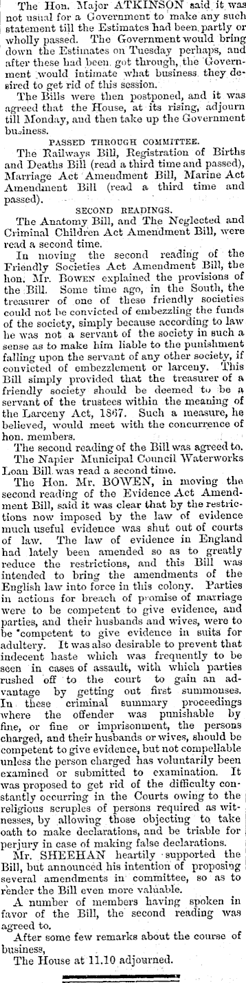 The Hon. Major ATKINSON said it was not usual for a Government to make any such statement till the Estimates bad been, partly or wholly passed. The Government would bring down the Estimates on Tuesday perhaps, and after these had been, got through,, the Government Would intimate what business, they desired to get rid of this session. The Bills were then postponed, and it was agreed that the House, at its rising, adjourn till Monday, and then take up the Government business. PASSED THROUGH COMMITTEE. The Railways Bill, Registration of Births and Deaths Bill (read a third time and passed). Marriage Act Amendment Bill, Marine Act Amendment Bill (read a third time and passed). - SECOND READINGS. The Anatomy Bill, and The Neglected and Criminal Children Act Amendment Bill, were read a second time. In moving the second reading of the Friendly Societies Act Amendment Bill, the hon. Mr. Bowen explained the provisions of the Bill. Some time ago, in the South, the treasurer of one of these friendly societies could not he convicted of embezzling the funds of the society, simply because according to law be was not a servant of tbe society in such a sense as to make him liable to the punishment falling upon the servant of any other society, if convicted of embezzlement or larceny. This Bill simply provided that the treasurer of a friendly society should be deemed to be a servant of the trustees within the meaning of the Larceny Act, 1867. Such a measure, he believed, would meet with the conciurence of hon. members. The second reading of the Bill was agreed to. The Napier Municipal Council Waterworks Loan Bill, was read a second time. The Hon. Mr. BOWEN, in moving the second reading of the Evidence Act Amendment Bill, said it was clear that by the restrictions now imposed by the law of evidence much useful evidence was shut out of courts of law. The law of evidence in England had lately been amended so as to greatly reduce the restrictions, and this Bill was intended to bring the amendments of the English law into force in this colony. Parties in actions for breach of promise of marriage were to be competent to give evidence, and parties, and their husbands and wives, were to be 'competent to give evidence in suits for adultery. It was also desirable to prevent that indecent haste which was frequently to be seen in cases of assault, with which parties rushed off to the court to gain an advantage by getting out first summonses. In these criminal summary proceedings where the offender was punishable by fine, or fine or imprisonment, the persons charged, and their husbands or wives, should be competent to give evidence, but not compellable unless the person charged has voluntarily been examined or submitted to examination. It was proposed to get rid of the difficulty constantly occurring in the Courts owing to the religious scruples of persons required as witnesses, by allowing those objecting to take oath to make declarations, and be triable for perjury in case of making false declarations. Mr. SHEEHAN heartily supported the Bill, but announced his intention of proposing several amendments in’ committee, so as to render the Bill even more valuable. A number of members having spoken in favor of the Bill, the second reading was agreed to. After some few remarks about tbe course of business, The House at 11.10 adjourned.