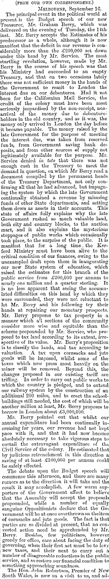 (prom our own correspondent.) Melbourne, September IG. The principal event in the political world at present is the Budget speech of cur new Treasure!’, Mr. Graham Berry, which waa delivered on the evening of Tuesday, the 14th inst. Mr. Berry accepts the Estimates of his predecessor as a whole, although it is now manifest that the deficit in our revenue is considerably more than the £200,000 set down under this head by Mr. Service. The most startling revelation, however, made by Mr. Berry in the course of his speech was that his Ministry had succeeded to an empty Treasury, and that on two occasions lately there was not sufficient money in the hands of the Government to remit to London the interest due on our debentures. Had it not been for the Californian Mail Service, the credit of the colony must have been most seriously jeopardised by the non-receipt, nonarrival of the money due to debentureholders in the old country, and as it was, the money only arrived in London the day before it became payable. The money raised by the late Government for the purpose of meeting the interest due, waa taken from reserved funis, from Government saving bank deposits, and from other sources of supply not legitimately available for the purpose,. Mr. Service denied in toto that' there was not enough cash in the Treasury to meet the demand in question, on which Mr Berry read a document compiled by the permanent heads of the Treasury Department, not only confirming all that he had advanced, but impugning the system by which the late Government continually obtained a revenue by misusing funds of other State departments, and setting them down as assets in their accounts. This state of affairs fully explains why the late Government rushed so much valuable land, both city and country blocks, to the auction mart, and it also explains the mysterious stoppages of public works which occasionally took place, to the surprise of the public. It is manifest that for a long time , the Kerferd Ministry must have been alive to the critical condition of our finances, owing to the unexampled draft upon them in inaugurating our new State system of education, which raised the estimates for this branch of the public service from £200,000 per annum to nearly one million and a quarter sterling. It is no less apparent that seeing the accumulated difficulties on this head by which they were surrounded, they were not reluctant to let Mr. Berry and his following try their hands at repairing our monetary prospects. Mr. Berry proposes to tax property in a manner which all sections of the community consider more wise and equitable than the scheme propounded by Mr.‘ Service, who proposed to tax land according to its extent, irrespective of its value. Mr. Berry’s proposition is to classify the lands, and tax according to valuation. A tax upon cornsacks and jute goods will be imposed, whilst some of the taxes which now press most heavily on the miner will be removed. Beyond this, the changes proposed in our existing tariff are trifling. In order to carry out public works to which the country is pledged, and to extend our railway system by the construction of an additional 200 miles, and to erect the schoolbuildings still needed, the cost of which will be another million at least, Mr. Berry proposes to borrow in London about £3,000,000. Mr. Berry pointed out that whilst our annual expenditure had been continually increasing for years, our revenue bad not kept pace with it, and that it had now become absolutely necessary to take vigorous steps to curtail the extravagant expenditure of the Civil Service of the colony. He estimated that by judicious retrenchment in this direction a saving of at least £IOO,OOO per annum could be safely effected. The debate upon the Budget speech will commence this afternoon, and there are many rumors as to the direction it will take and the result it may accomplish. A few warm supporters of the Government affect to believe that the Assembly will accept the proposals propounded, while a number of equally sanguine Oppositionists declare that the Government will be at once overthrown on theitem of cornsacks and jute goods. The fact is that parties are so divided at present, that no concerted action need be apprehended by Mr. Berry. Besides, few politicians, however greedy for office, care about facing the duty of governing, when their first act must bo to levy new taxes, and their next to carry out a number of disagreeable reductions in the public service, and so restore our financial condition to something approaching soundness. The Hon. John Kobertson, Premier of New South Wales, is now on a visit to us, and ad-