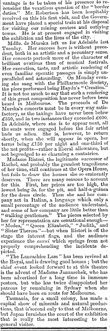 vantage is to be taken of bis presence to reconsider the vexatious question of the “border duties.’ 1 Mr. Eobertaon has been hospitably received on this his first visit, and the Government have placed a special train at his disposal for ‘ visiting our mining centres and outlying towns. : He is at present engaged in visiting the exhibition and the lions of the city. ■ Mdlle. de Murska left us for Adelaide last Tuesday. Her success here is without precedent, both in an artistic and a pecuniary sense. Her concerts partook more of the character of brilliant ovations than of musical festivals. ■ Her execution, taste, and artistic rendering of even familiar operatic passages is simply unparalleled and astounding.' On Monday evening she sang with : the Philharmonic Society, the piece performed being Haydn’s “ Creation.” It is not too much to say that such a rendering of this great composition.has never before been heard in Melbourne. The proceeds of He Murska’s concerts must be in every way satisfactory, as the takings have never been below £350, and in two instances they exceeded £6OO. In Adelaide, where she is to appear next, all the seats were engaged before the fair artist bade us adieu. She is, however, to return shortly, when she will appear in opera, her terms being £l5O per night and one-third of the net profits—rather a liberal allowance, but not begrudged to so charming a cantatrice. Madame Eistori, the legitimate successor of Eaohel, and probably the grandest tragedienne of her time, still continues at the Opera House, but; fails to draw the houses she so eminently deserves. There are many reasons to account for this. First, her prices are too high, the lowest being 3s. for the pit, and half-agninea for the dress circle. Then she and her company act in Italian, a language which only a small percentage of the audience understand, and some of her company are little better than “ walking gentlemen.” The pieces selected by her for representation are sensational enough—- “ Medea,” “Queen Elizabeth,” “Judith,” and “ Sister Theresa”—but when Eistori is off the stage the interest flags, and the audience experience the ennui which springs from not properly comprehending the incidents depicted. “The Lancashire Lass ” has been revived at the Eoyal, and is drawing good houses ; but the chief event looked forward to at this theatre is the advent of Madame Jananschek, who has been advertised for a long time in immense posters, but who has twice disappointed her patrons by remaining in Sydney when she should have been en route for Melbourne. Tasmania, for a small colony, has made a capital show of minerals and natural productions, that is'second only to that of Melbourne, but Japan furnishes the court of the exhibition that is really the most interesting to the general visitor. , ,