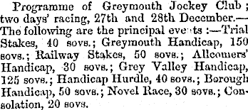 Programme of Greymouth Jockey Club ; two days' racing, 27th and 28th December.— The following are the principal events :—Trial Stakes, 40 so vs.; Greymouth Handicap, 150 sovs.; Railway Stakes, 50 sovs.; Allcomers' Handicap, 30 bovb.; Grey Valley Handicap, 125 sovs.; Handicap Hurdle, 40 sovs.; Borough Handicap, 50 sovs,; Novel Race, 30 sovs.; Consolation, 20 sovs.