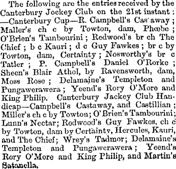 The following are the entries received by the . Canterbury Jockey Club on the 21st instant: Canterbury Cup—R. Campbell's Cas' away ; Mailer's ch c by Towton, dam, Phoebe ; O'Brien's Tainbourini; Rodwood's br ch The Chief ; b c Kauri; d c Guy Fawkes; br cby Towton, dam, Certainty ; Nosworthy's br c Tatler ; P. Campbell's Daniel O'Rorke ; Sheen's Blair Athol, by Ravensworth, dam, Moss Rose ; Delamajne's Templeton and Pungawerawera; Yeend's Rory O'More and King Philip. Canterbury Jackey Club Handicap—Campbell's Castaway, and Castillian ; Miller's ch c by Towton; O'Brien's Tambourini; Lunn's Nectar; Redwood's Guy Fawkes, ch c by Towton, dam by Certainty, Hercules, Kauri, and The Chief; Wrey's Tadmor; Delamaine's Templeton and Pungawerawera; Yeend's I Rory O'More and King Philip, and Martin's 1 Satanella,