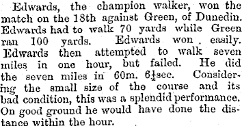Edwards, the champion walker, won the match on the 18th against Green, of Dunediu. Edwards had to walk 70 yards while Green ran 100 yards. Edwards won . easily. Edwards then attempted to walk seven miles in one hour, but failed. He did the seven miles in 60m. 6|sec. Considering the small size of the course and its bad condition, this was a splendid performance. On good ground he would have done the distance within the hour.