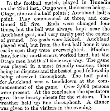 Iu thp football match, played in Dunedin on the 22nd inst., Otago won, the'scores being— Otago, nine and a half points ; Auckland, half a point. Play commenced at three, and continued till five. Ends were changed four times, but the ball was always kept near the Auckland goal, and very rarely past the centre of ground. No goals wore lacked. Auckland played well, but from the first half hour it was easily seen they were overweighted. Macfarlane, for the northerners, worked hard, but the Otago men had it nU their own way. The game was played in a most friendly manner, there being no disputes and thebestof good-fellowship being observed throughout. The half point for Auckland wns a touchdown at the commencement of the game. Over 3,000 persons were present. At the conclusion the spectators gave three hearty cheers for the visitors. The weather held up fine throughout. " A dinner was given to the visitors in the evening.