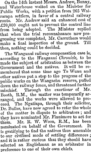 On the 14th instant Messrs. Andrew, Bunny, and Waterhouse waited on the Minister for Public Works, with a petition from 265 Wairarapa settlers, in favor of a central railway route. Mr. Andrew said an enhanced cost of £20,000 ought not to prevent the central line from being adopted. The Minister replied that when the trial reconnaissance now progressing was completed, Mr. Carruthers would make a final inspection of the ground. Till then, nothing could be decided. The Wanganui railway compensation case is, according to the Wanganui Chronicle, to be made the subject of arbitration as between the Government and the natives. It will be remembered that some time ago Te Wunu and other natives put a stop to the progress of the public works on the Wangaehu reserve, pulled down the railway fence, and threatened further mischief. Through the exertions' of Mr. Booth, R.M., the matter was temporarily arranged, and the works were allowed to proceed. The Ngatiapa, through their solicitor, Dr. Buller, have now agreed to refer the whole of the matter in dispute to arbitrators ; and they have nominated Mr. Finnimore to act for them. Mr. It. W. Wbon, R.M., has been nominated on behalf of the Government. It is "ratifying to find the natives thus amenable to our civilised mode of settling differences ; and it is rather curious that they should have selected an Englishman as an arbitrator in preference to one of their own chiefs.