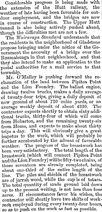 Considerable progress is being made with the extension of the Hutt railway, the weather of late having been favorable for outdoor employment, and the bridges are now in course of construction. The Upper Hutt tunnel is also being actively pushed ahead, though the difficulties met are not a few. The Wairarapa Standard understands that the residents in the neighborhood of Gladstone propose bringing under the notice of the Government the necessity of a bridge over the Ruamahunga in that neighboi hood, and that they also intend to make an application to the postal authorities for a mail service to that township. Mr. O'Malley is pushing forward the reclamation of the land between Pipitea Point and the Lion Foundry. The ballast engine, | drawing twelve trucks, makes a daily average of twenty-four trips, giving a daily deposit of new ground of about 720 cubic yards, or an average weekly deposit of about 4320. The contractor expects shortly to obtain sixty additional trucks, thirty-four of which will come from Hobarton, and the remaining twenty-six from Home, and expects to make about thirty trips a day. This will obviously give a great impetus to the work, which will probably be further accelerated by the advent of favorable weather. The progress of the breastwork has been very satisfactory. The total length of the breastwork (which will connect Pipitea Point and the Lion Foundry) will be fifty-two chains, of these seventeen are already completed, being about one-third of the entire length of the line. The piles and shields of the breastwork are of jarrah wood, while the cap is of totara. The total quantity of made ground laid down up to the present writing, is not less than four acres. If circumstances favor his wishes, the contractor will shortly have two shifts of workmen employed during every twenty-four hours, so as to push on the work as fast as possible.