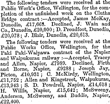 The following tenders were received at the Public Work's Office, Wellington, for the completion of the unfinished work on the Clutha Bridge contract: —Accepted, James McKay, Dunedin, £17,668. Declined, J. Wain and Co., Dunedin, £20,000; D. Proudfoot, Dunedin, £20,078; J. Blair, Dunedin, £20,613. The following tenders were received at the Public Work 3 Office, Wellington, for the Paid Paki-Waipawa contract of the Napier and Waipukurau railway : —Accepted, Tracey and Allen, Napier, £7989. Declined, Firth and Borne, Napier, £9288; Joseph Jay, Picton, £10,931; C. McKirdy, Wellington, £11,752 ; Allen and Kingstreet, Waipukurau, £13,943 ; S. D. Powdrell, Napier, £14,618 ; H. Willis, Napier, £15,642; McS weeny, Anderson, McSweeny, and Buddie, Napier, £22,400.