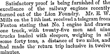 Satisfactory proof is being furnished of the excellence of the railway engines recently turned out of the Lion Foundry. Mr. B. W. Mills on the 14th inst. received a telegram from Foxton stating that No. 1 engine had drawn one truck, with twenty-five men and_ nine trucks loaded with sleepers, weighing in all some forty tons, a distance of two miles, and had made the' return trip inclusive in twelve minutes.